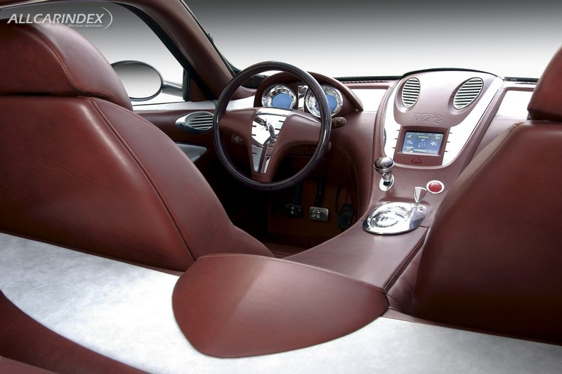 Brown leather and light grey alcantara trim is used to cover both the interior and the seats. The steering wheel rim and the gear lever knob have authentic wood inlays.