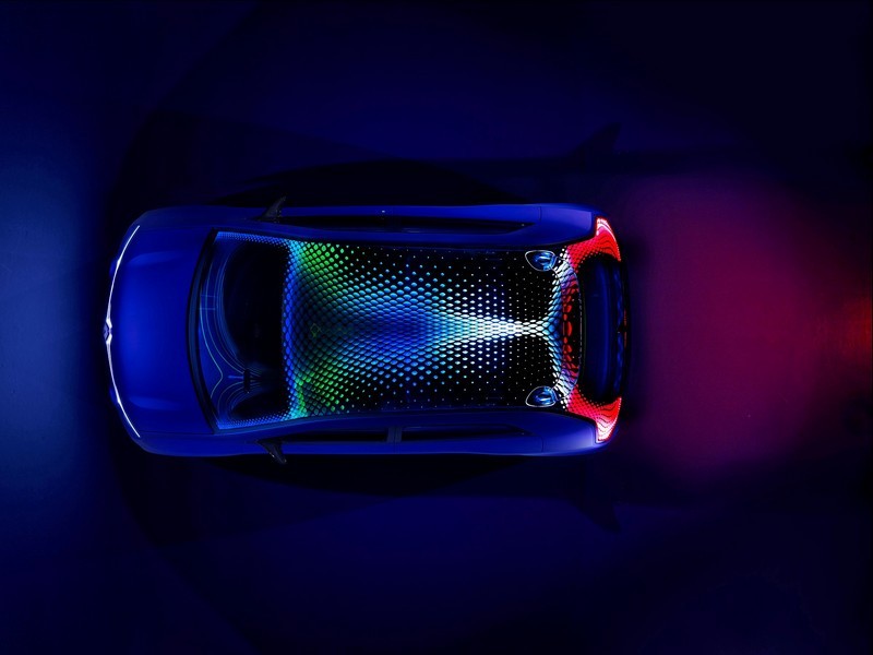 A sequence of LEDs also extends from the grille to the rear bumper via the roof. A pattern of light originates from the Renault lozenge badge and flows towards the head lights before climbing up over the windscreen pillars, along the roofline and then back down to the rear bumper. This light path creates a magical effect which appears to bring Twin’Z alive.