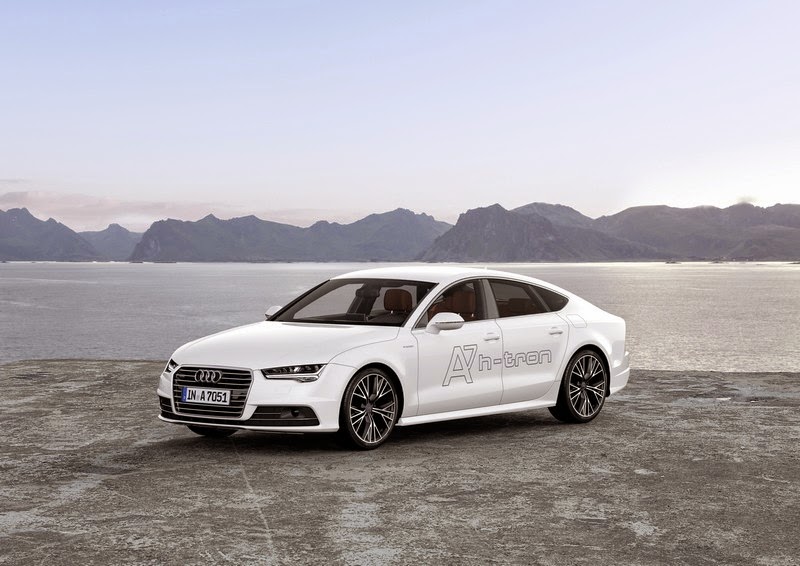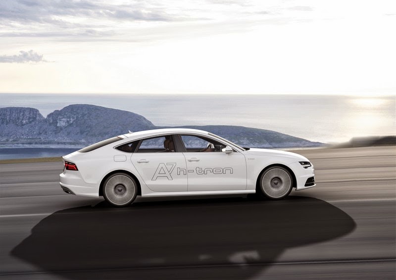 It sprints from 0 to 100 km/h (62.1 mi) in 7.9 seconds and on to a top speed of 180 km/h (111.8 mph). It covers over 500 kilometers (310.7 mi) on one tank of fuel – and its exhaust emits nothing more than a few drops of water: The A7 Sportback h-tron quattro, which Audi is unveiling at the Los Angeles Auto Show 2014, uses a powerful, sporty electric drive with a fuel cell as its energy source that operates in combination with a hybrid battery and an additional electric motor in the rear. The overall electrical system power of 170 kW is transferred to both the front and the rear wheels. This drive configuration makes the emission-free Audi A7 Sportback* a quattro through and through – a new departure in fuel cell cars.