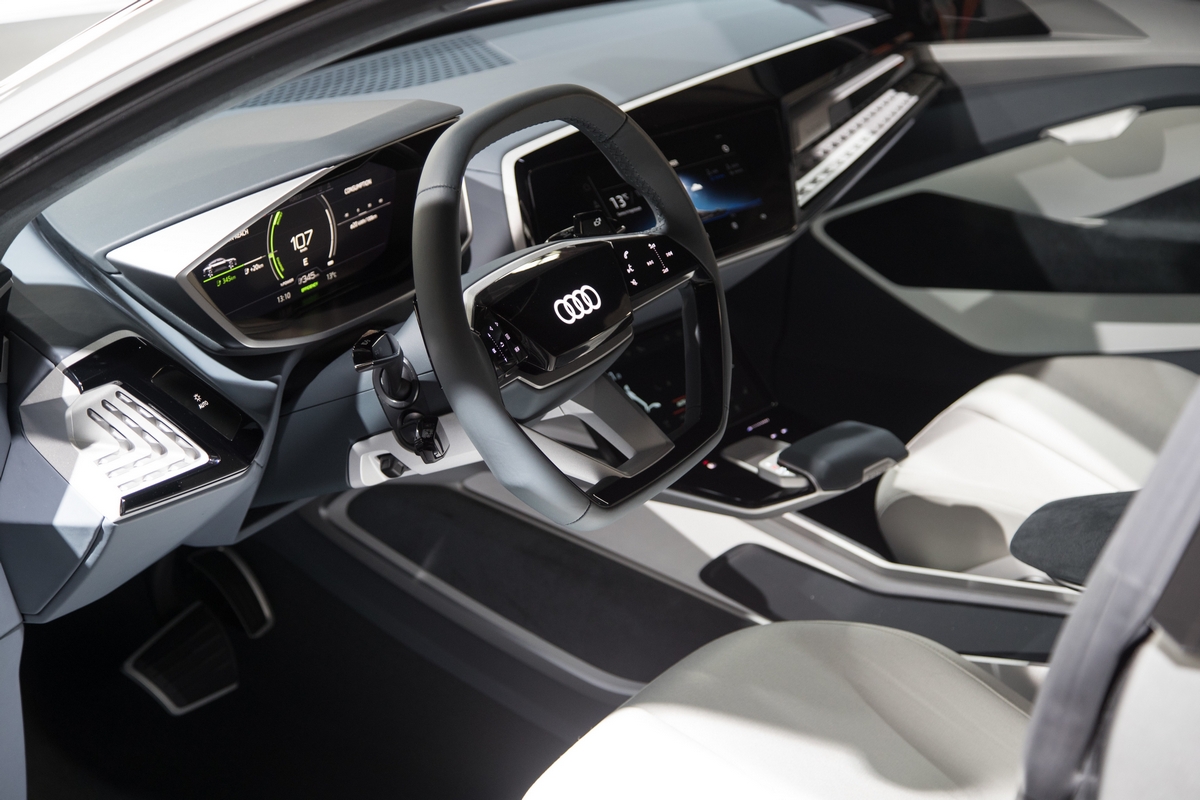 In its consciously light-colored interior the Audi e-tron Sportback concept offers a blend of functional clarity and reductive controls as a formal principle. Expansive touch-sensitive screens below the central display, on the center console and in the door trims supply information and interact with the on-board systems. Horizontal surfaces on the dashboard and the seemingly floating center console convey a sense of open perspectives for the occupants of the four individual seats.