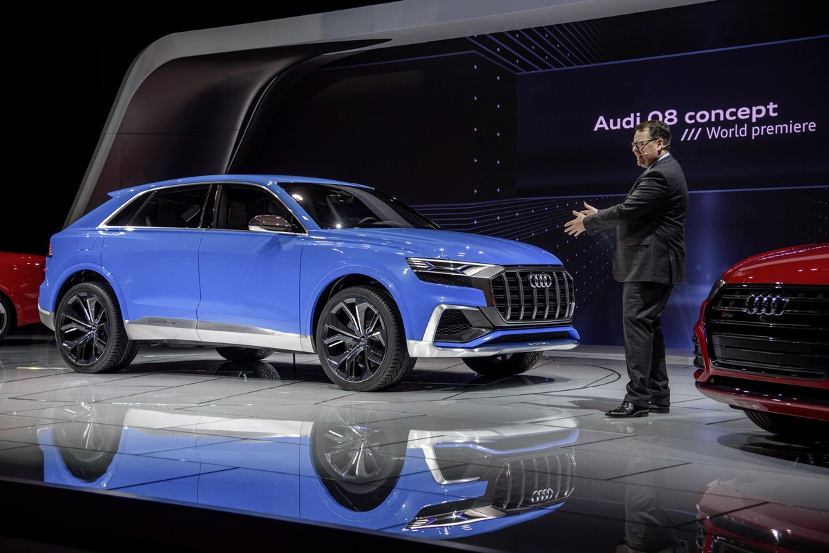 Dynamic, highly efficient and extremely comfortable: Audi presents the Audi Q8 concept at the North American International Auto Show (NAIAS) 2017. With this model the premium manufacturer is tapping into a new segment for the full-size class – an elegant alternative to the robust presence of a classic sport utility vehicle. The Q8 concept stands for maximum prestige. It combines the spaciousness typical of an SUV with the emotional lines of a coupe. Propulsion is provided by a powerful, yet highly efficient plug-in hybrid with 330 kW of system output and 700 Nm (516.3 lb-ft) of torque. The concept car is the basis for a production model that Audi will launch on the market in 2018.