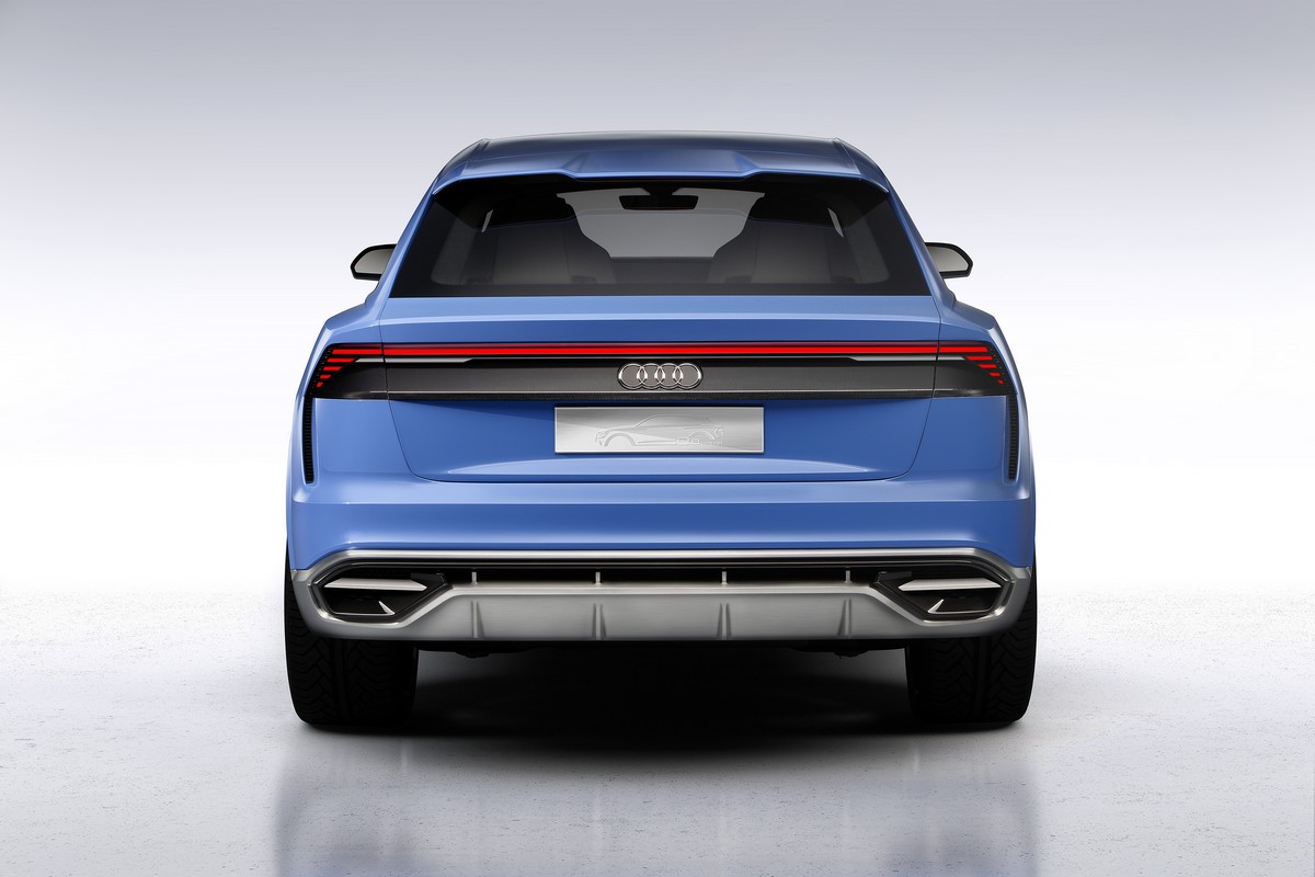 The license plate of the Audi Q8 concept is located on a black trim strip between the lights – a typical feature of the Audi Ur-quattro. The diffuser is made of aluminum; its clasp of high-gloss Carbon Atlas. This combination of materials is also used around the headlights to demonstrate sportiness.