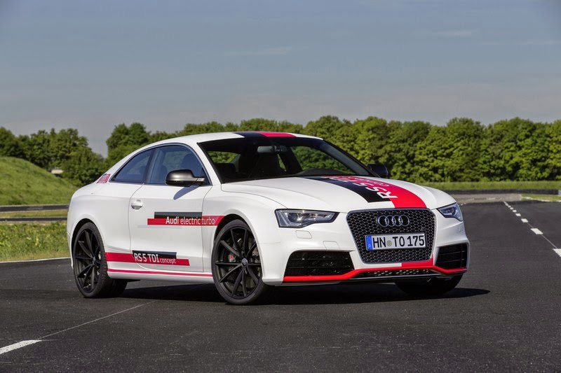 The V6 biturbo in the Audi RS 5 TDI concept produces 283 kW (385 hp); from 1,250 to 2,000 rpm it transfers 750 Nm (553.2 lb-ft) of torque to the crankshaft. The red-line is at 5,500 rpm. The supplemental electric turbocharger provides for staggering power when starting off. An electric motor replaces the turbine wheel and accelerates the compressor wheel to over 70,000 rpm in a few hundredths of a second. The exhaust turbochargers also provide as much as 2.4 bar of relative boost pressure.