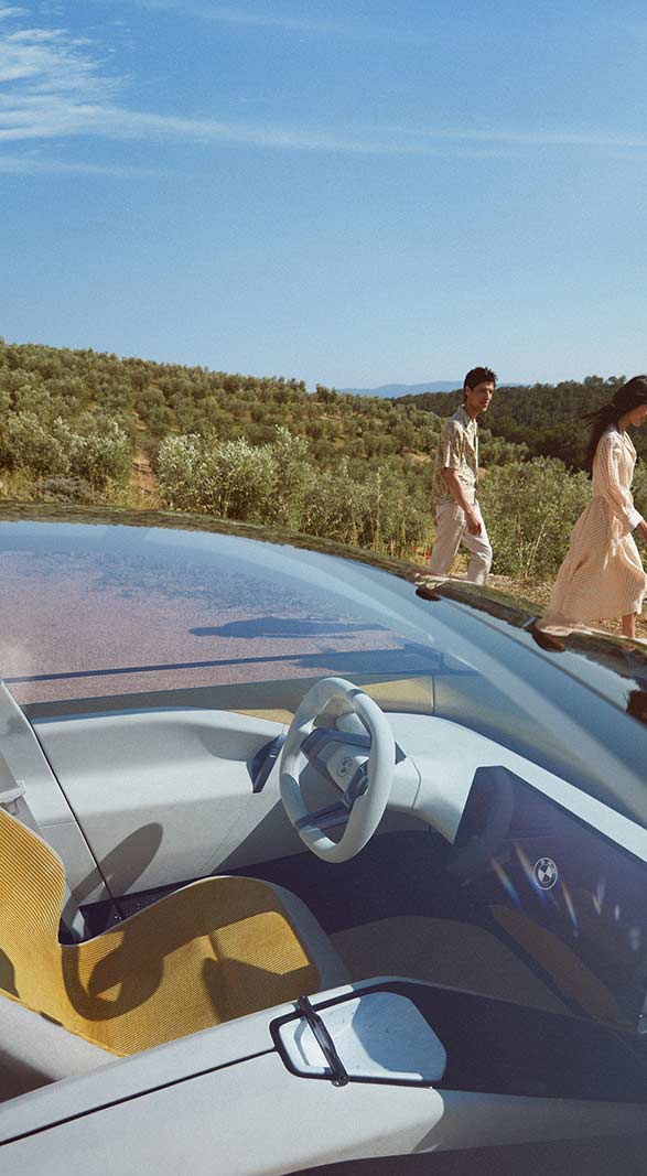 A fresh interpretation of the brand's signature design elements, like the BMW kidney grille and double headlights, transform the vehicle’s front-end into a single interaction area. A lighting effect with precise three-dimensional animation initiates intuitive interaction between the human and their vehicle as soon as they approach the car. E Ink elements in the lower portion of the side windows also feature in the exterior welcome scenario, directing attention to the sensor area that activates automatic door opening. Innovative technology similarly defines the design of the rear lights, with 3D-printed light elements that extend over several levels and are controlled in a targeted manner to create a unique impression of depth.