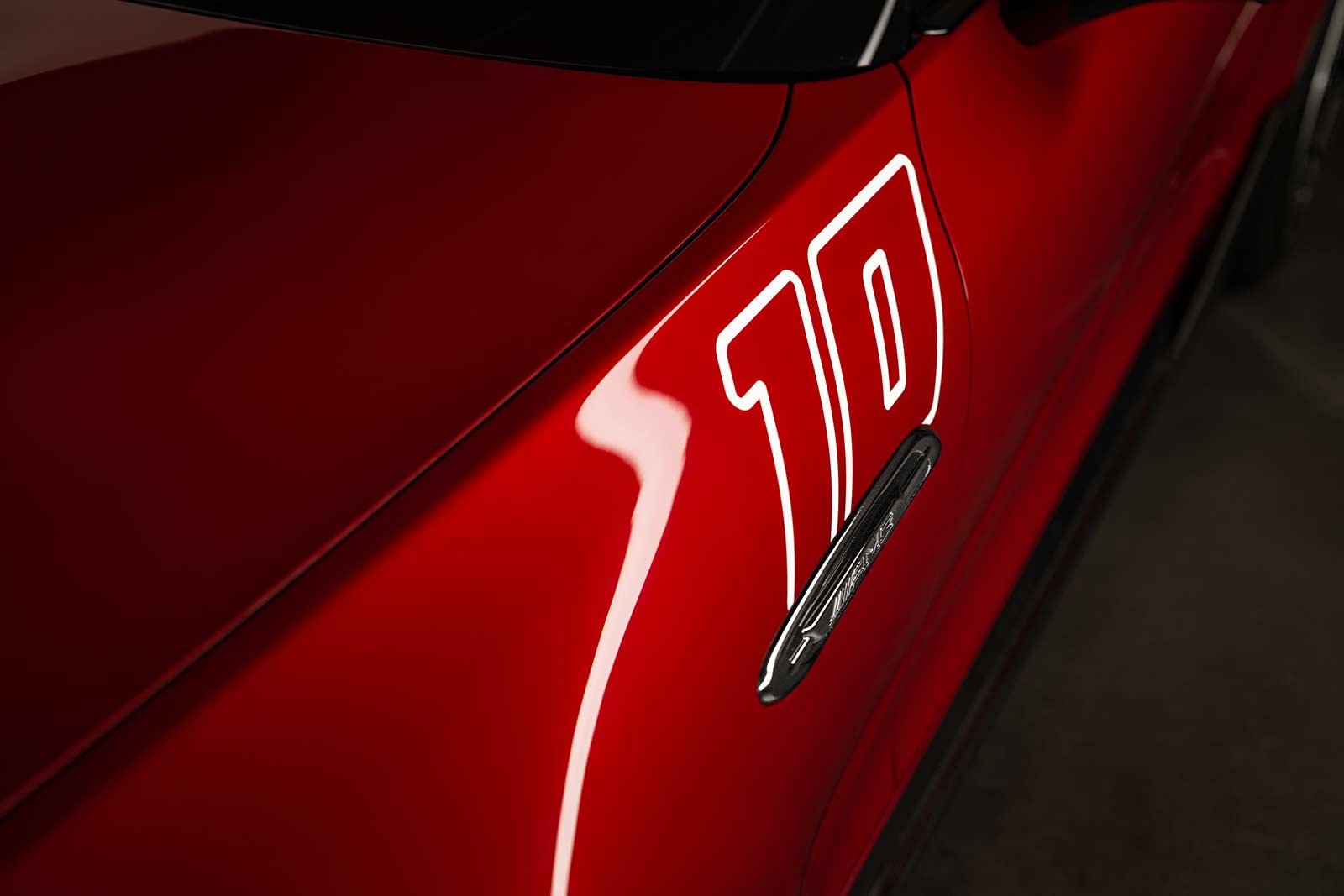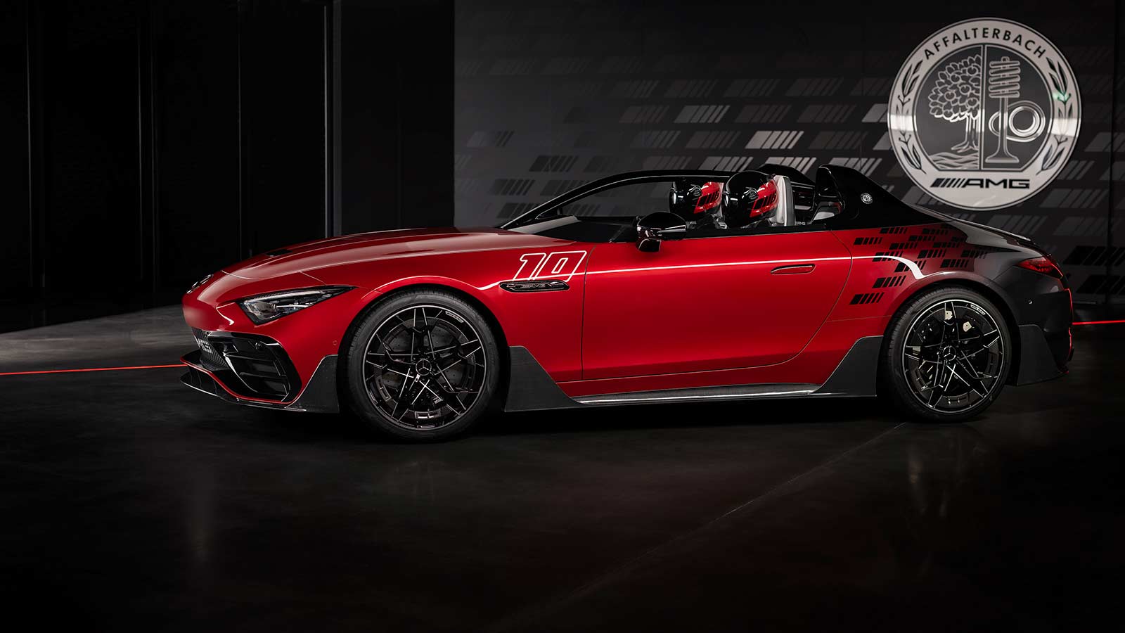 The eye-catching paintwork – in a colour gradient from Le Mans red to graphite grey with a black AMG pattern – alludes to the colour scheme of the victorious Mercedes car at the 1924 Targa Florio race in Sicily. It was painted red, which was typically reserved for Italian vehicles. German race cars were traditionally painted white at the time. The red paint was meant to deter local fans from impeding the car’s progress in the race. The coup worked. After 6:32:37.4 hours and a race distance of 432 kilometers, the victorious Mercedes 2-litre race car with the number 10 crossed the finish line in first place with Christian Werner behind the wheel. The number 10 can also be found on the front wings of the Concept Mercedes‑AMG PureSpeed and refers to that Targa Florio victory 100 years ago.