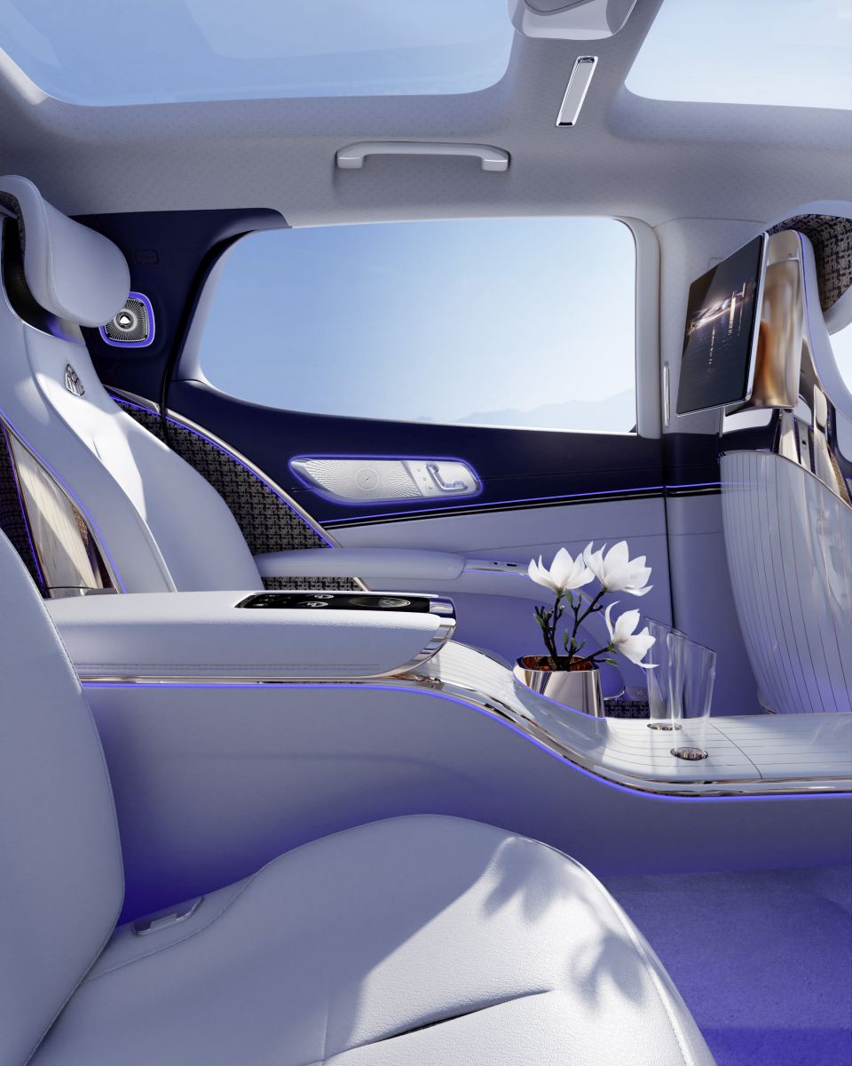 The aerodynamically optimised side running boards bear a customised inlay with the Maybach emblem. Generously dimensioned 24-inch light-alloy wheels in the Maybach “bowl” design – with five short spokes and a flat centre section – as well as Maybach lettering, emphasise the exclusive appearance of the all-electric SUV.