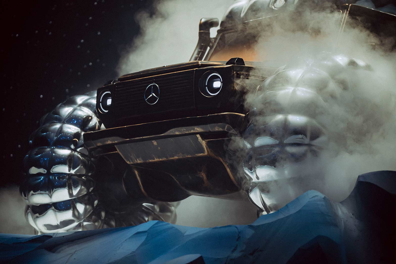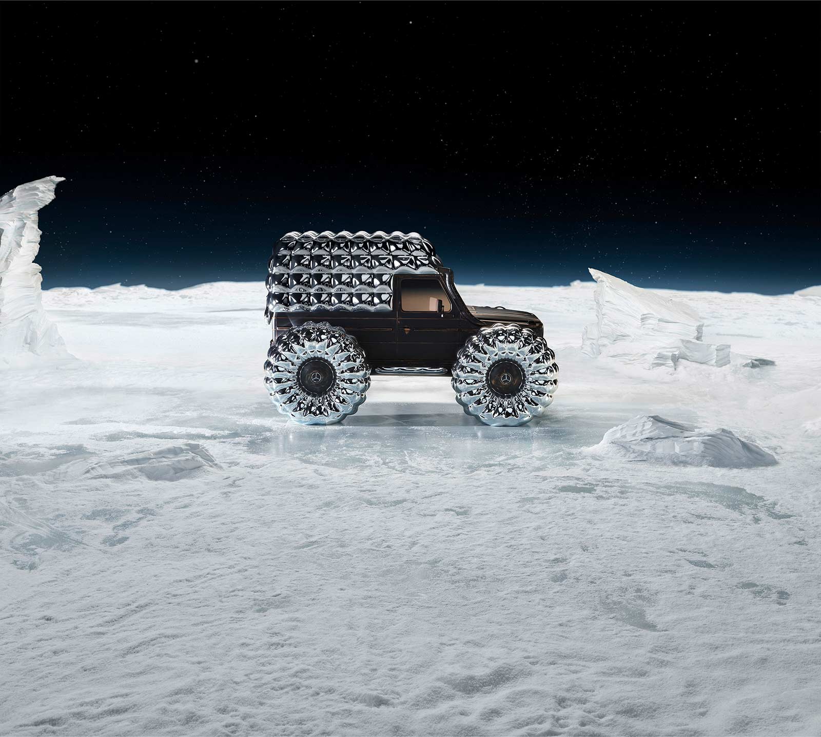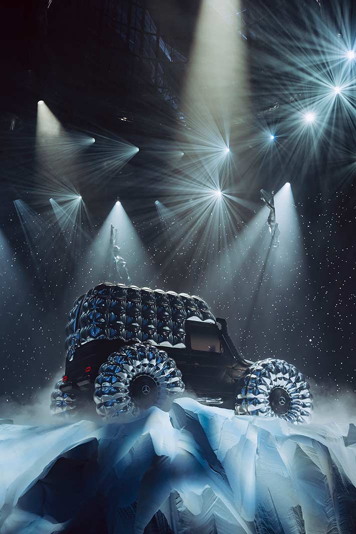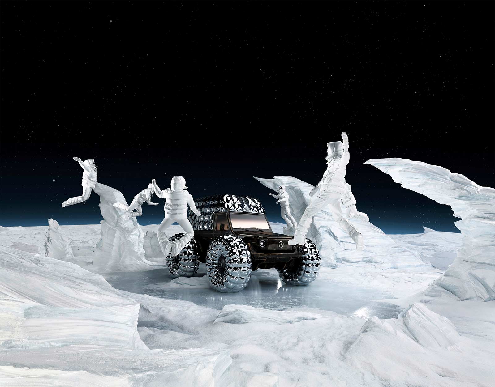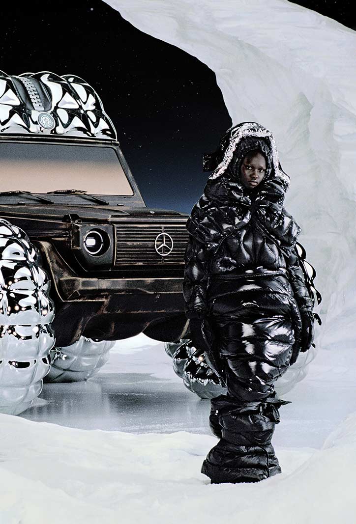 PROJECT MONDO G is the hero showcar of the campaign that accompanies the Mercedes-Benz and Moncler co-creation with social media, out of home (OOH) and PR assets for a broad global activation. The visualization stages an otherworldly winter landscape inspired by the main themes of outdoor durability and limitless discovery opportunities with the off-roader G-Class as basis of PROJECT MONDO G and the puffer jacket of Moncler. The look and feel is an imaginary universe with low gravity that interprets the art piece with fashionable moments by models wearing conceptual looks designed with Moncler collection items. The campaign set design mirrors the art piece reveal at the “The Art of Genius” show presenting the ability of the G-Class and the Moncler puffer jacket to withstand even in the harshest conditions. The campaign was lensed by the recognized director and photographer Thibaut Grevet.