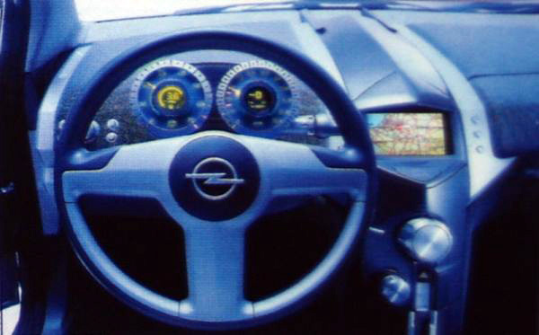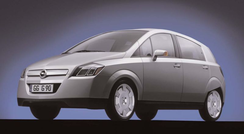 Lightweight construction, through and through The name of the four-seater Opel G90 (debut: Frankfurt Motor Show 1999) was chosen because the CO2 emission from the 60 hp three-cylinder gasoline engine is a mere 90 g per km. This represents an MVEG standard consumption of 3.88 l per 100 km. This amazing performance was made possible by the use of lightweight materials throughout, and by the extremely low drag coefficient for a vehicle of this size, namely 0.22. At the same time, the contours of the G90 give an insight into Opel's future body language. It also treads new paths in interior design.