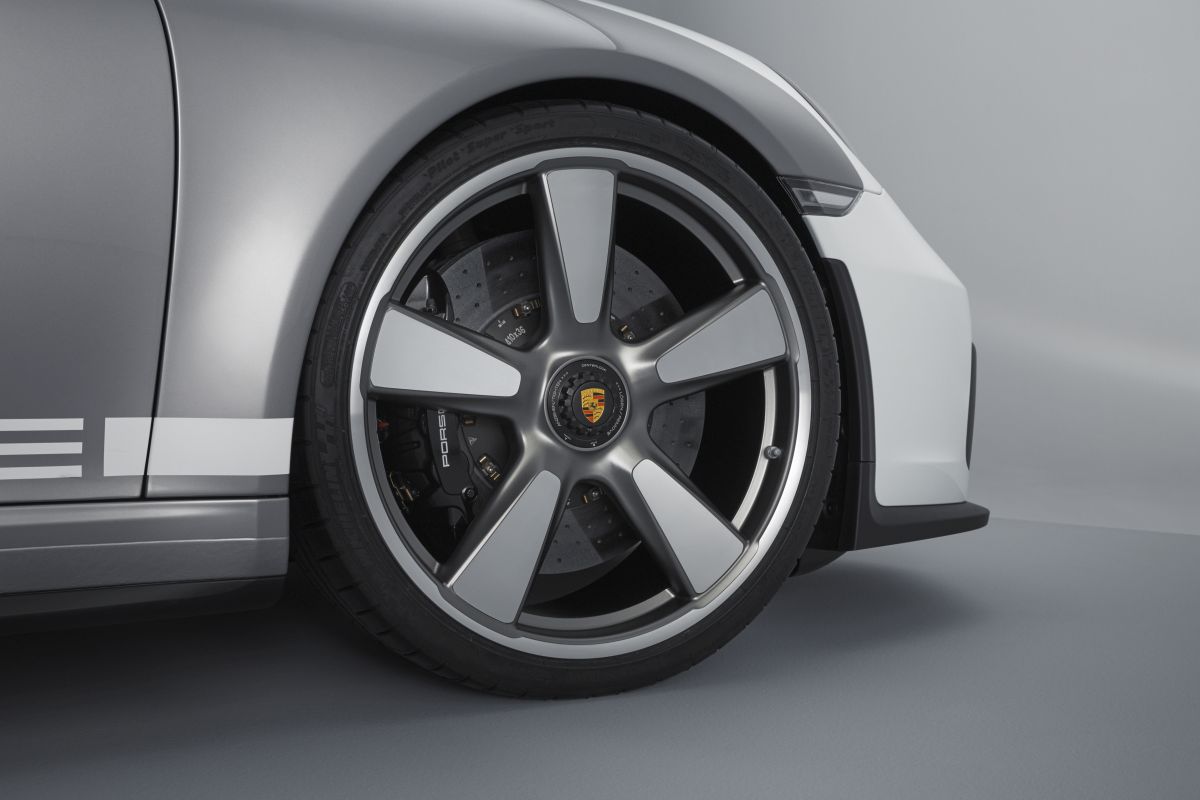 Below the bodywork, the 911 Speedster Concept relies on state-of-the-art components. The chassis essentially comes from the 911 GT3, with contrasting high gloss polished clover-leaf details on the imposing 21-inch rims in Fuchs design. It is the first time that these wheels are presented with centre locks. The GT developers also contributed the exhaust system with titanium tailpipes and the powertrain, which includes a six-speed manual transmission. The six-cylinder flat engine in this minimalist concept study delivers over 500 hp and reaches speeds of up to 9,000 rpm.