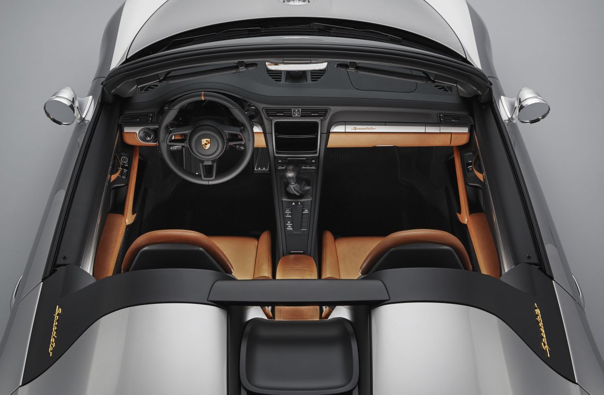 As dictated by the historic original, the 911 Speedster Concept also features a lightweight tonneau cover instead of a convertible top. This cover protects the car interior from rain when parked, and is attached using eight Tenax fasteners. The lightweight principles of the Speedster philosophy continue through into the interior, where the navigation, radio and air conditioning systems have all been eliminated. The full bucket seats are made of carbon, and the light brown Aniline leather covers in Cognac 356 pick up on features from the car’s classic predecessors.