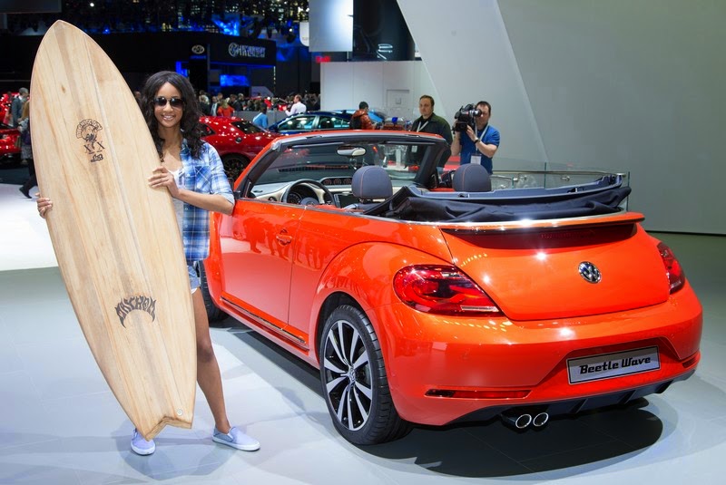 The concept car Beetle Wave in "Habanero Orange Metallic" reflects the American spirit on the East and West coast beaches of the USA. This spirit is also expressed in the convertible's interior. Fabric patterns from the 1950s and 60s influence the design of the center seat panels, and there is a genuine wood dashpad that is designed in traditional surfboard style.