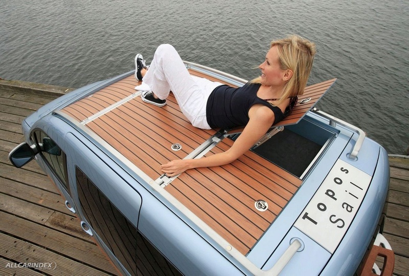 The Caddy Topos Sail design concept, based on the smallest model in the Volkswagen Commercial Vehicle van range, uses design cues from classic yachts and has its multi-functional roof covered with wooden decking surrounded by aluminium roof rails.