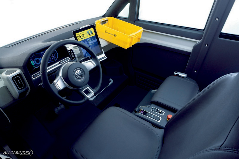 Mail container system. Volkswagen Group Research and the German Post Office tuned multiple parameters to attain perfect logistics – route guidance and access to parcels. The first and simplest yet very effective step by the experts was to systematically improve the storage of postal items in the vehicle. In the cargo space, the various sized containers that are used, and which contain the sorted mail items, can be simply and quickly snapped into lightweight alloy brackets on the vehicle walls. Up to 3 additional containers may be mounted in front of the driver’s standing seat.
