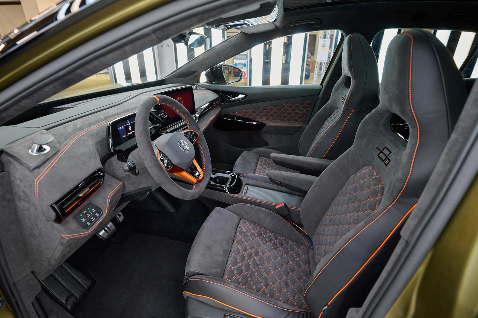 Both Alcantara and vegan leather were used in the interior, making a sustainability statement. The cockpit, steering wheel, door trims and roof liner were upgraded. The seats themselves are real eyecatchers. The saddlers developed a complete, continuous pattern from the ID honeycomb. This is embroidered on the central sections of the seats and the door trims. The project logo was embroidered on the front headrests. This consists of the ID logo combined with a figure 8, symbolizing the number of projects completed to date.