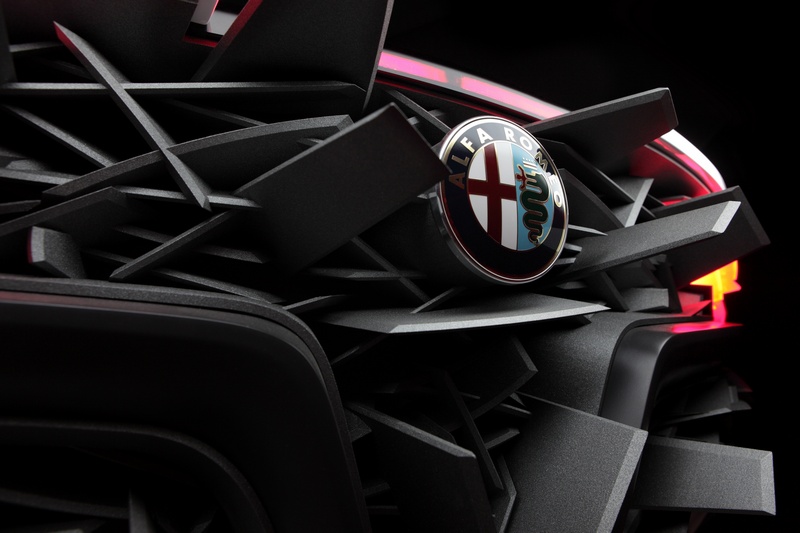 The Pandion’s front end features a long and sculpted sloping bonnet that creates what is, to all intents and purposes, a mask, almost like the helmets worn by ancient warriors. The Alfa Romeo ‘family feeling’, immediately recognizable at first glance, does not admit even a hint of retro nostalgia and looks to the future with a revolutionary and novel elegance. There is no doubt it’s an Alfa Romeo with a look that has never been seen heretofore. The typical Alfa quad headlights are buried deep in the outer-most tips of the T-shaped grille, highlighting the wide stance of the impressive coupé. Four white bars of light strike the observers’ curiosity, two position lights above and two fog lights below, creating a virtual bi-plane of light at night. The typical five horizontal bars on every Alfa Romeo radiator grille are just visible here, offering a reference to the marque’s historic identity. The front grille is full of thousands of tiny intertwined blades which contribute to the new Algorithmic Design throughout the car.