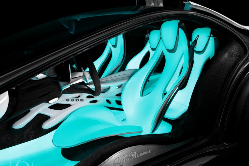 According to this interpretation, the vibrant energy in every Alfa Romeo is represented by Pandions’ spinal structure (or ‘Frame’), which crosses the length of the car from the V-shaped grille in the nose of the car to the V-shaped bumper in the tail of the car, crossing the interior as a visually aesthetic structural element which supports the surrounding shell (or ‘Skin’).