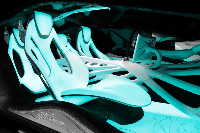 The taillights are fully integrated into the organic tangle of the blades and disappear when turned off. The new Alfa Romeo family feeling is again visible in the rear of the car with same V-shaped bumper found on the front of the vehicle, which the travels the entire length of the body, forming a powerful virtual, Alfa Romeo backbone.