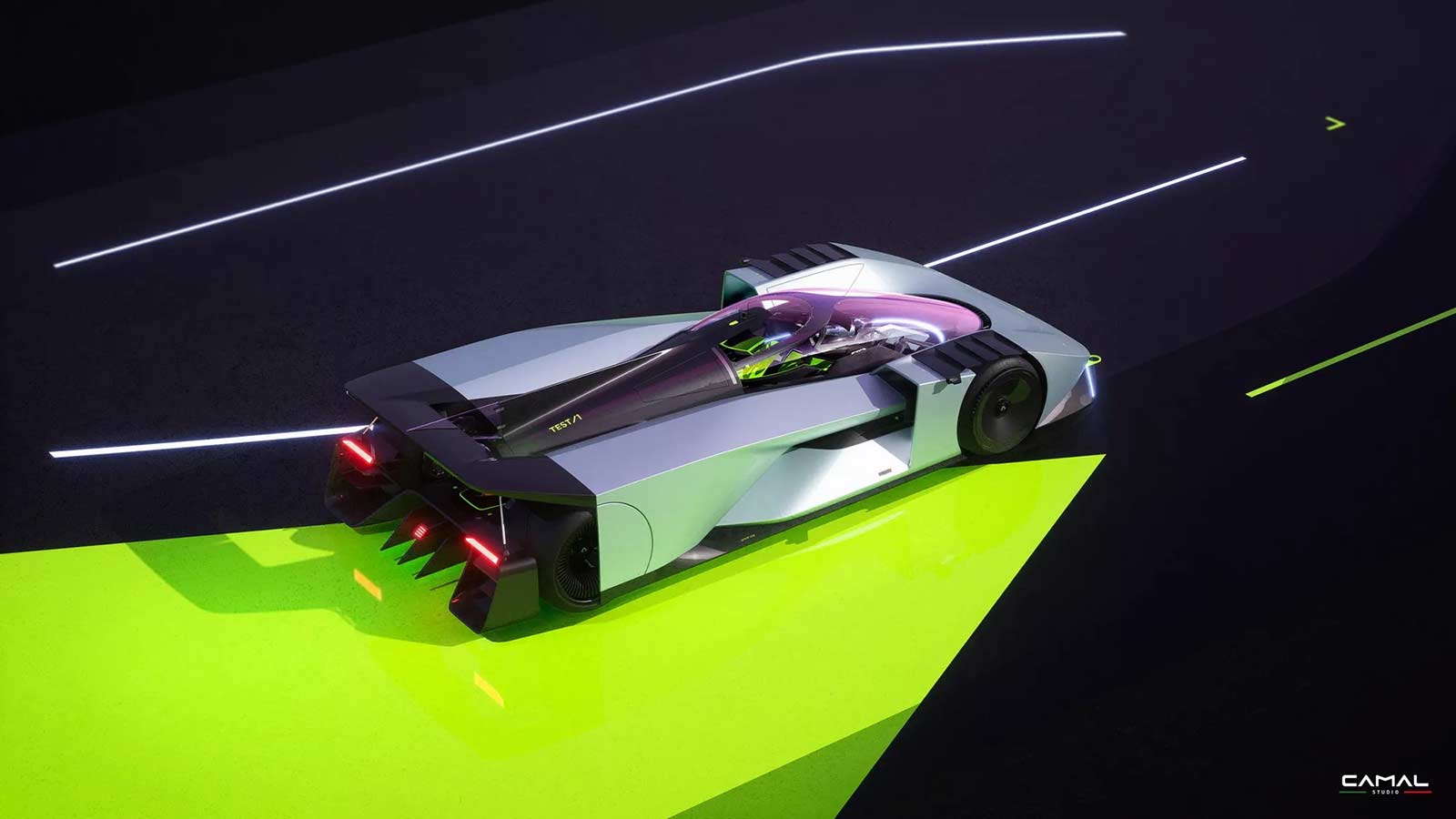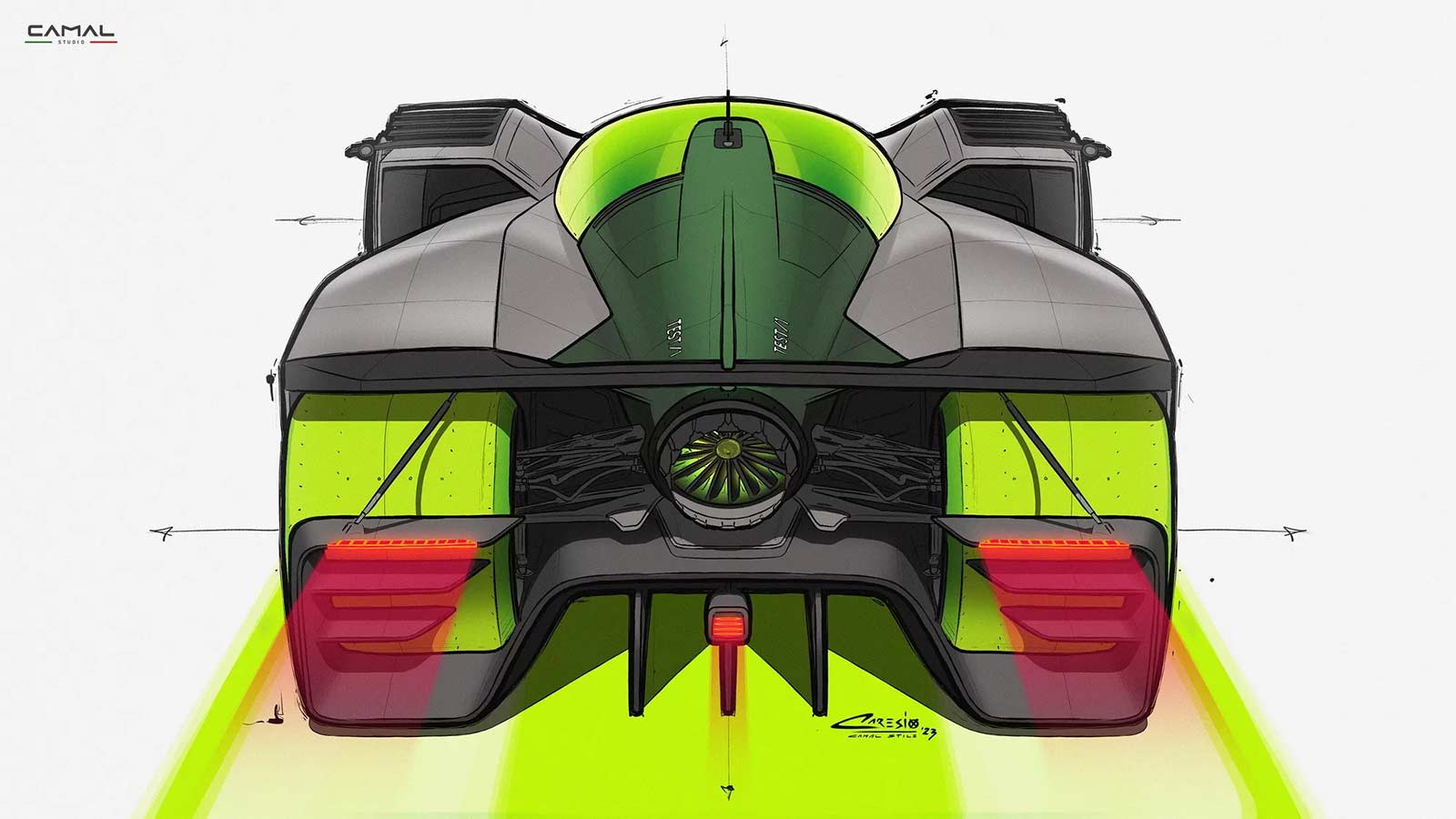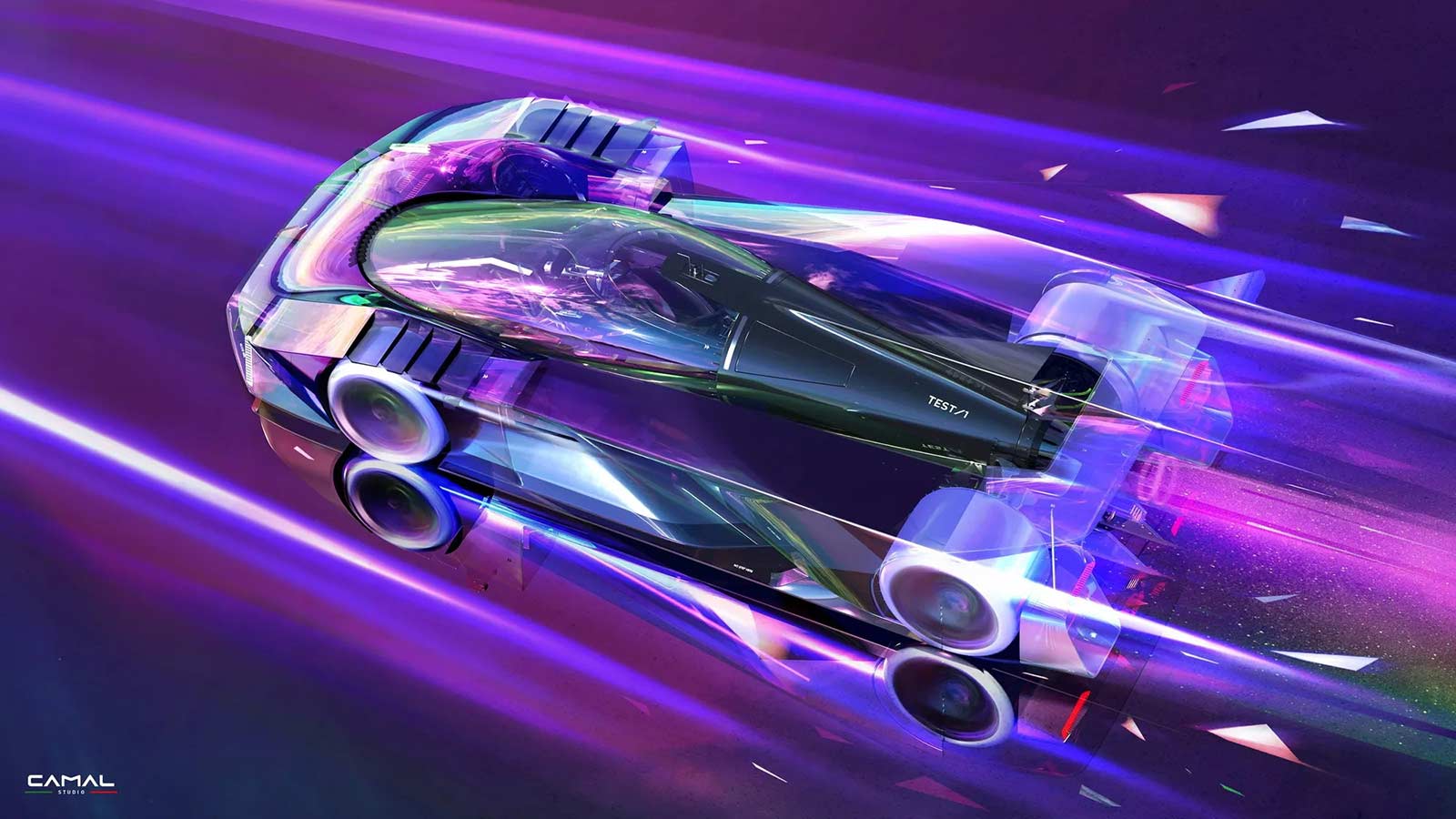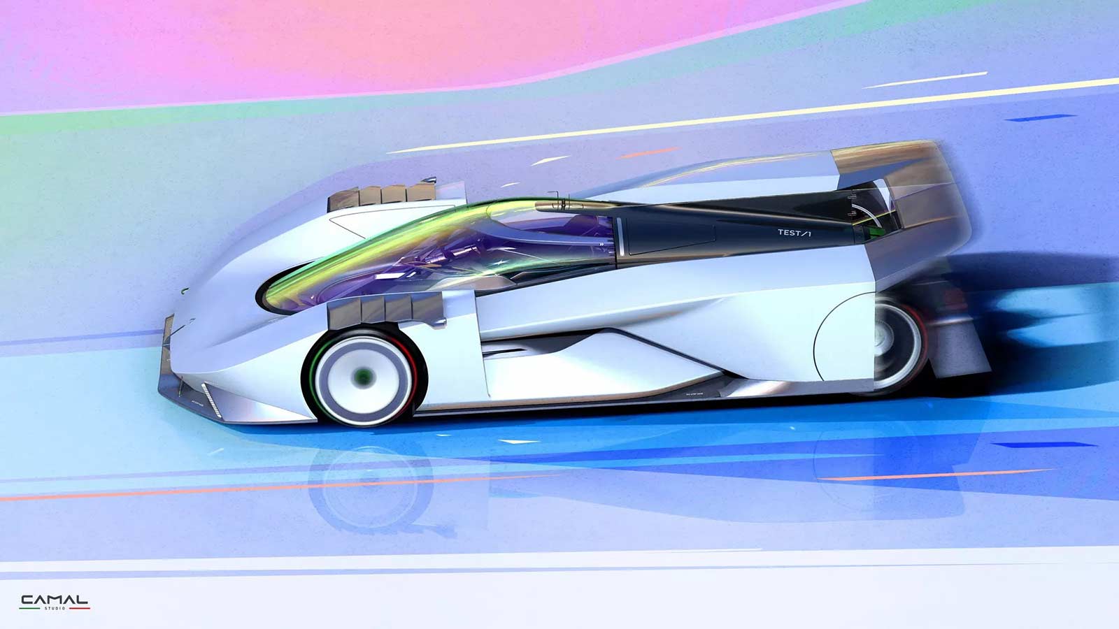 TEST/1 is the stylistic interpretation of a sports car on LMH proportions, powered by a powerful jet engine, as a nostalgic tribute by the CAMAL team to the historic Fiat Turbina of the 1950s. The design of the car seeks to explore the new trends of the moment, embracing sculptural lines and monolithic volumes, interspersed with clean lines and exposed mechanics. Through a completely transparent ‘rocket shape’ cabin, the wedge-shaped body of the car defines aerodynamic profiles, using sharp sections and large openings necessary for the powerful aero engine.