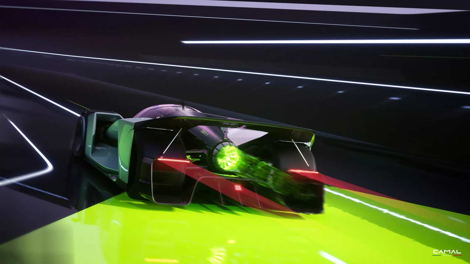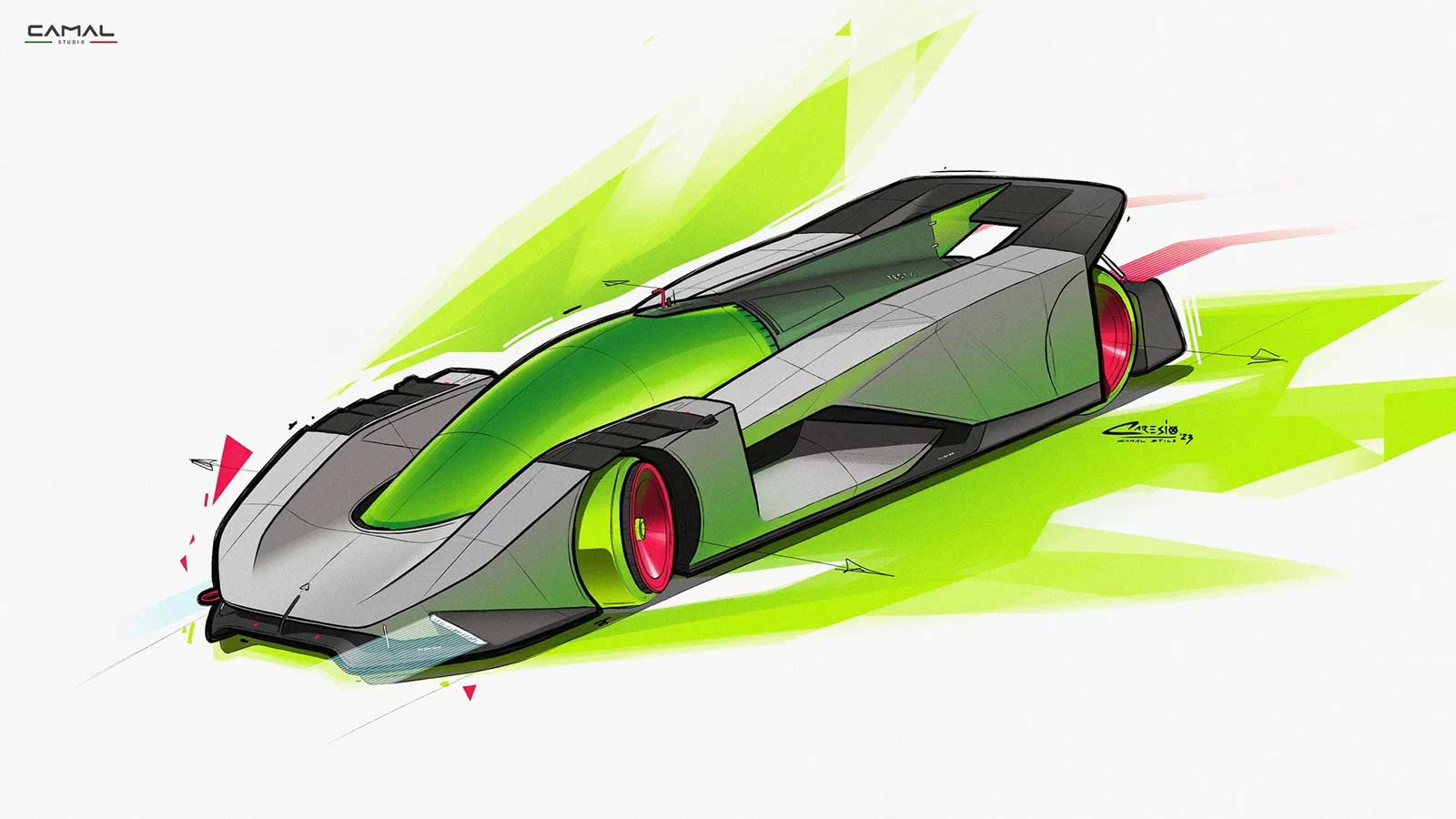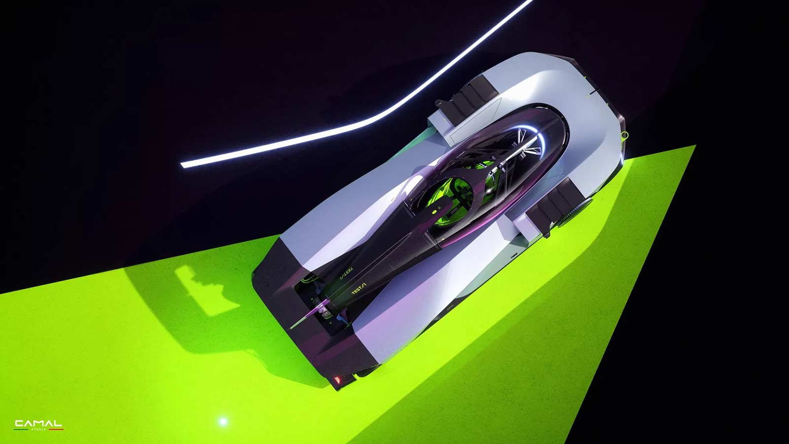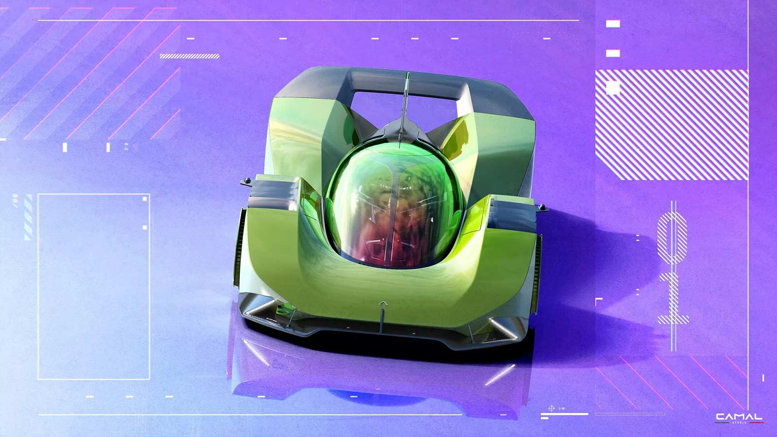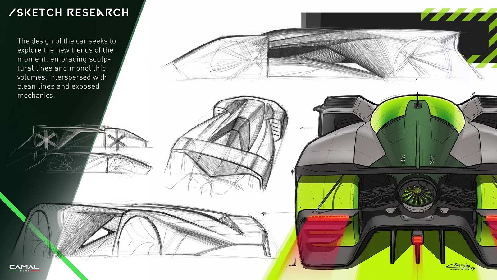 TEST/1 is the stylistic interpretation of a sports car on LMH proportions, powered by a powerful jet engine, as a nostalgic tribute by the CAMAL team to the historic Fiat Turbina of the 1950s. The design of the car seeks to explore the new trends of the moment, embracing sculptural lines and monolithic volumes, interspersed with clean lines and exposed mechanics. Through a completely transparent ‘rocket shape’ cabin, the wedge-shaped body of the car defines aerodynamic profiles, using sharp sections and large openings necessary for the powerful aero engine.