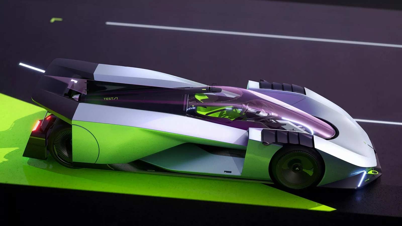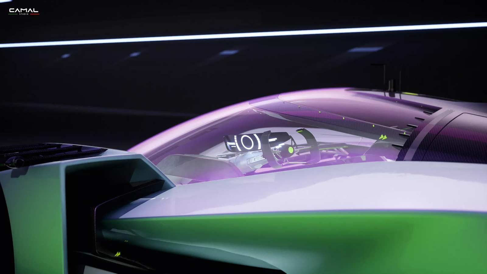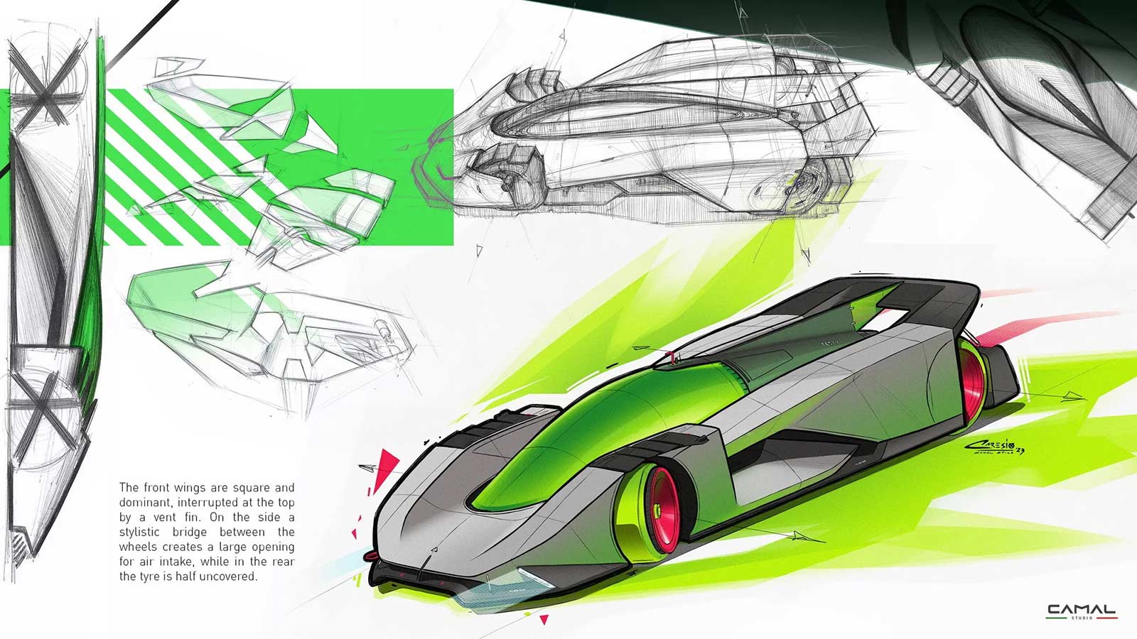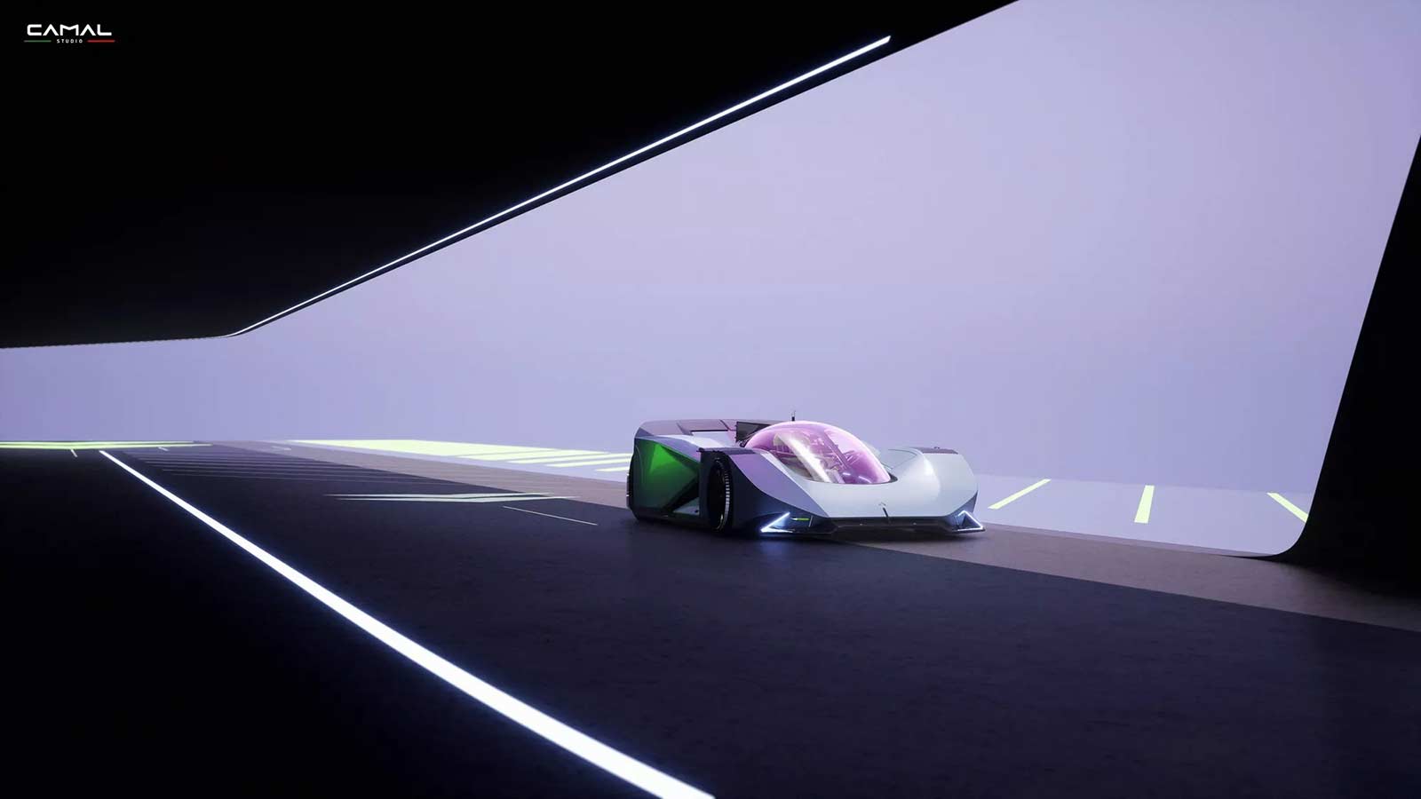 TEST/1 is the stylistic interpretation of a sports car on LMH proportions, powered by a powerful jet engine, as a nostalgic tribute by the CAMAL team to the historic Fiat Turbina of the 1950s. The design of the car seeks to explore the new trends of the moment, embracing sculptural lines and monolithic volumes, interspersed with clean lines and exposed mechanics. Through a completely transparent ‘rocket shape’ cabin, the wedge-shaped body of the car defines aerodynamic profiles, using sharp sections and large openings necessary for the powerful aero engine.