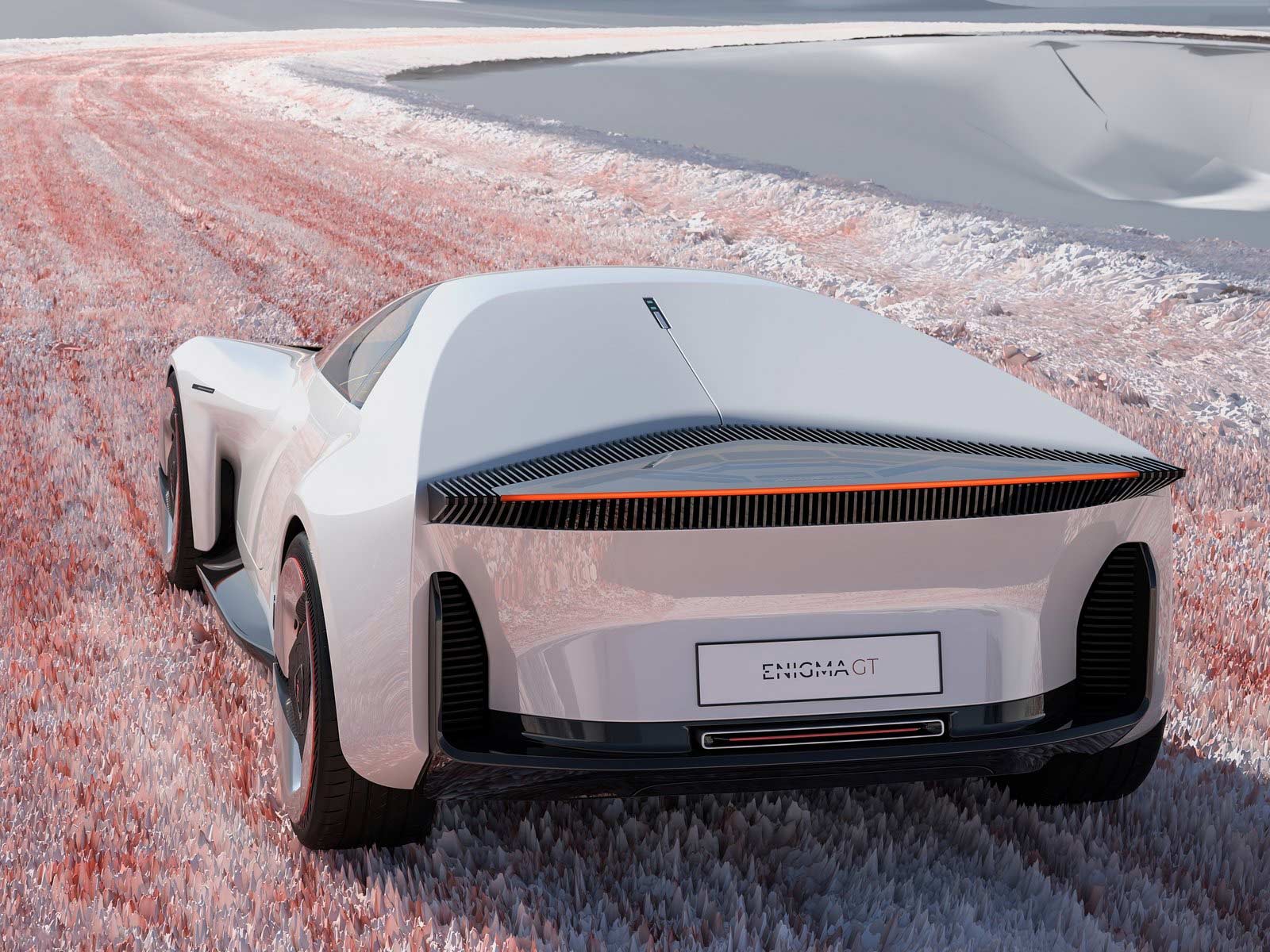 - Active Aero-Tail: The Active Aero-Tail controls the vehicle’s personality. By modifying the positions of the delta wing and diffuser, Enigma GT can switch from performance to efficiency in an instant