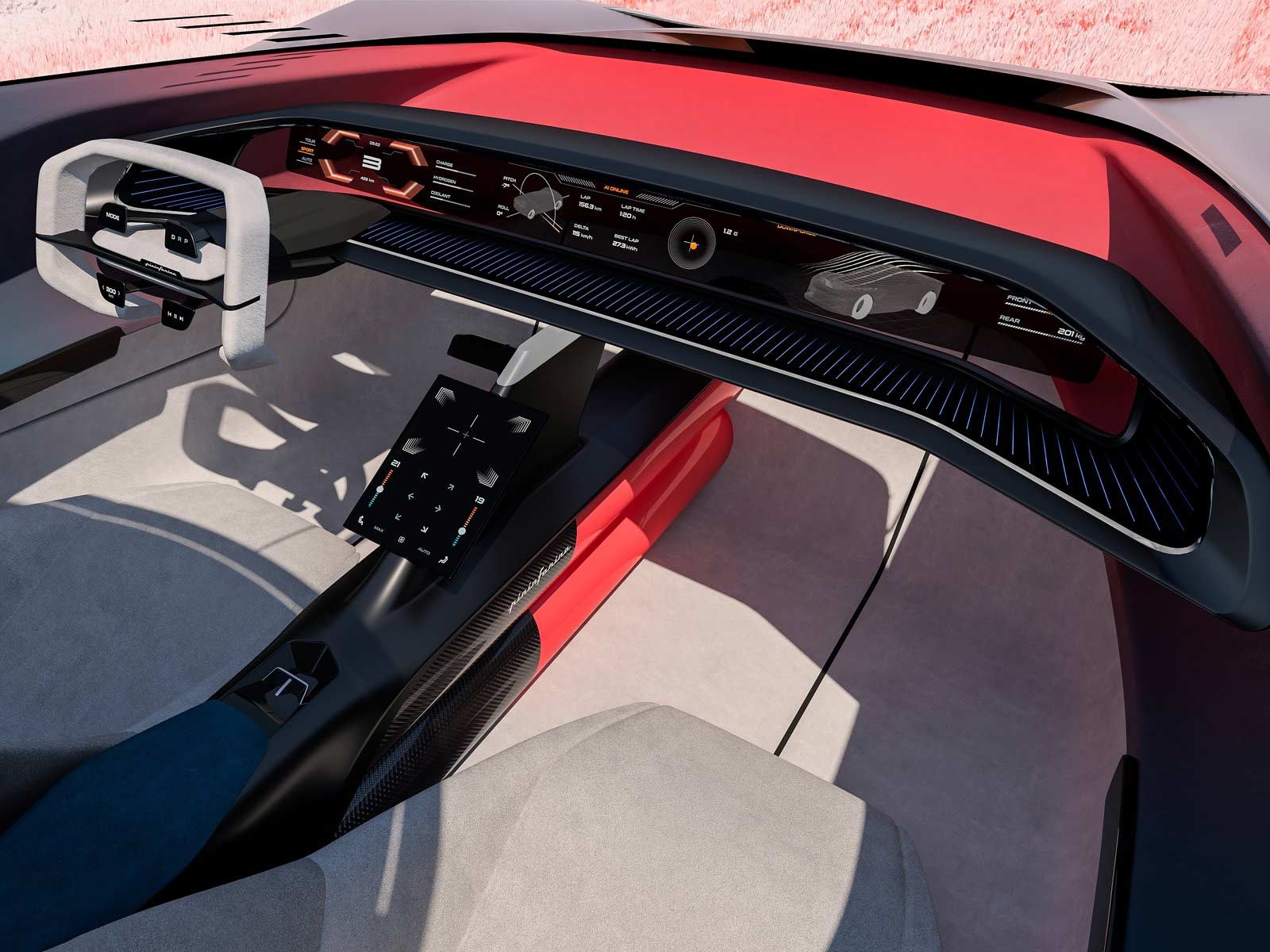 The approach focused on ingenious, advanced and sustainable materials finds expression in the light-sculpted seating in the front, suggesting comfort. An uninterrupted band of high-touch material creates an intimate and sporty atmosphere within and integrates the rear seats.