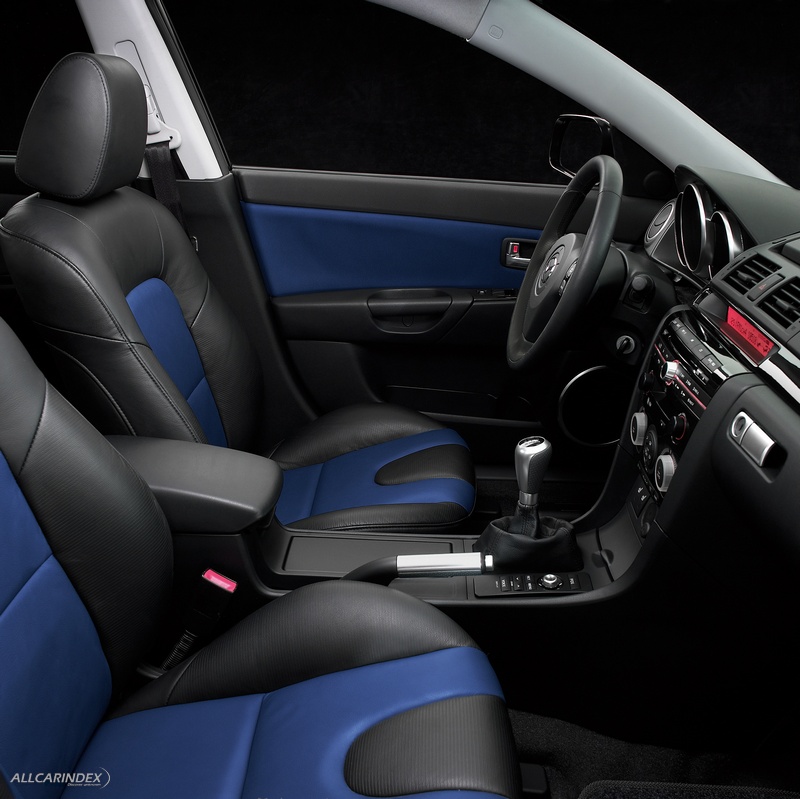 For the interior, Mazda presents a sporty yet comfortable design, an overall ambiance that evokes visual excitement and, thanks to materials carefully selected for their texture and appearance, adds to the overall delight of driving. The instrument panel and door trim have a simple, clean-cut form that creates a modern-looking space with an open, spacious feel. Finished in a high-gloss, piano black appearance, the instrument panel's central stack is not only elegant, it assures good visibility and ease-of-use when driving. In addition, the three-meter cluster and metallic interior accents add to the exquisite interior appearance.