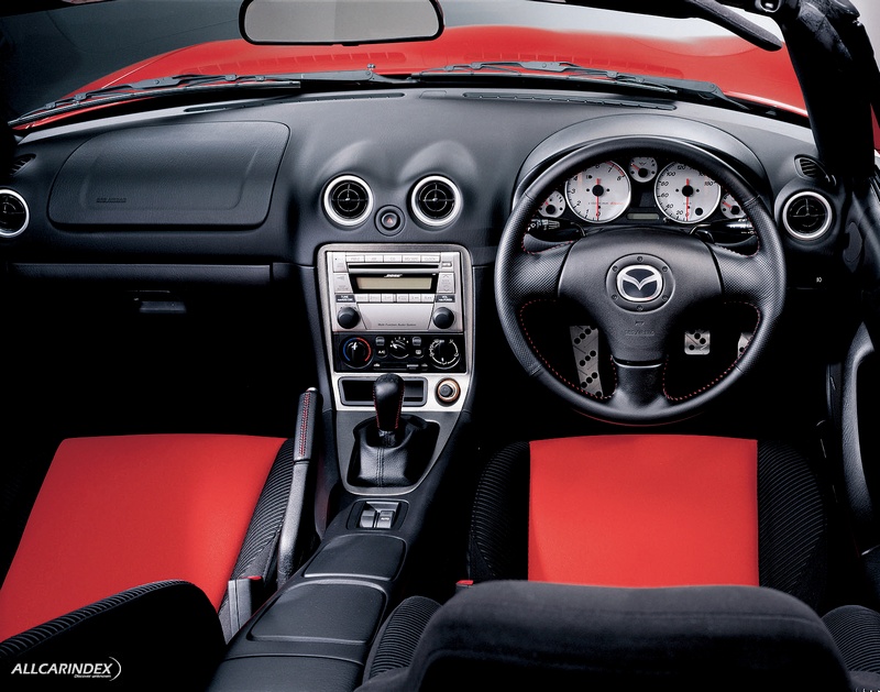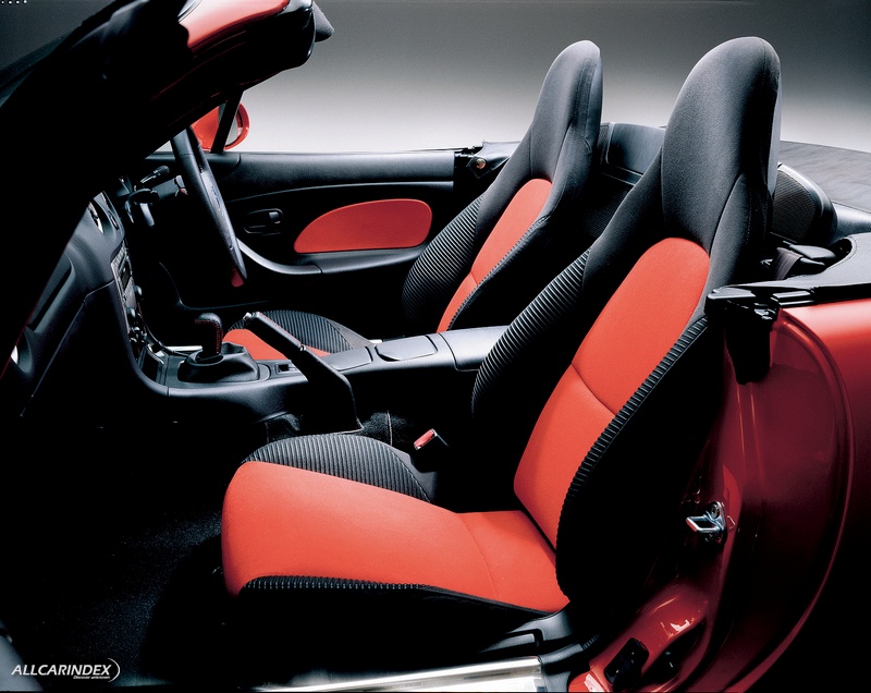 The Roadster Turbo show vehicle at the 2003 Tokyo Motor Show features special two-tone seats with a central section in red fabric, while black fabric is used for the sides to present a sporty and stylish ambience. Door trim is also in red, and red stitching is used to good effect on the shift knob and parking brake lever. The dashboard’s center panel and shift panel are finished in metallic paint. Aluminum alloy pedals and footrests complete Roadster Turbo’s high-performance image.