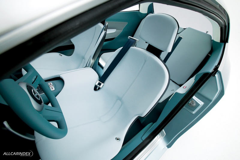 The interior itself has two bucket seats in the front connected by an integrated armrest over the centre console and a bucket-like rear seating area for up to two passengers. Colours are monotone, blue-green and light grey, made of soft high quality materials with textural qualities chosen to reflect the illumination system in a way that enhances the sense of the interior as being alive.