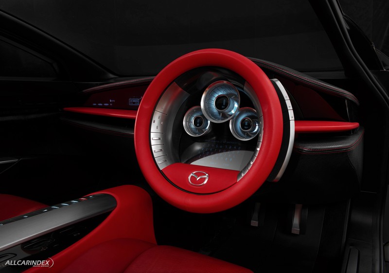 The lower display is based on an information-display concept similar to that presented in the MX-Crossport. It incorporates a large panel showing the settings and operating status of the navigation, audio, and climate-control systems. These systems can be controlled by devices designed separately for the driver and front passenger. Notably, the devices provide steering-wheel-mounted switches that the driver can use while the car is moving and a control panel within the steering wheel that the driver can use when the car is stationary. Consequently, the driver does not need to move out of his or her driving position.