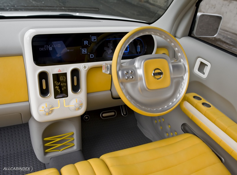 Inside, the Denki Cube Concept reflects the designers’ intention of creating a relaxing, moving social hub, like a favorite room in an owner’s house. Though the production Cube offers three rows of seating, the Denki Cube Concept offers only two rows and the wheelbase has been stretched 9.4 inches in order to better accommodate the lithium-ion battery cells. The newly designed front and second row seats are joined by a revised instrument panel with an IP-mounted shift button, a special steering wheel design and new door panel and cargo area trim.