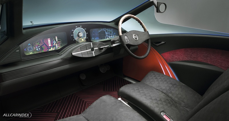 Inspired by the dashboard in the original Datsun Roadster, the instrument panel is rendered in a simple fan-shaped surface construction that incorporates cylindrical instruments.