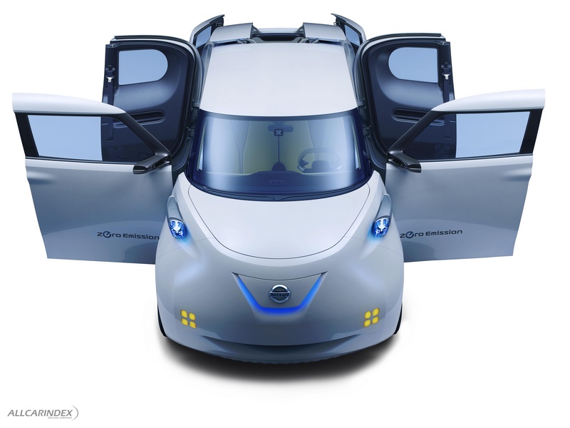 Externally Nissan Townpod consist of many familiar elements, yet it is different. It employs the same zero-emission technology found within Nissan LEAF. Charging points can be found in the nose behind an automatically retracting cover, which appears to be backlit thanks to its electric blue painted surrounds reflecting subtly off the car's "Stratosphere White" body paint. Similar electric blue hints are visible behind the door handles, number plate, the spokes of the alloy wheels and within the headlamp pods. The car does not need to shout that it is an EV. It more subtly suggests its ecological and economical credentials.