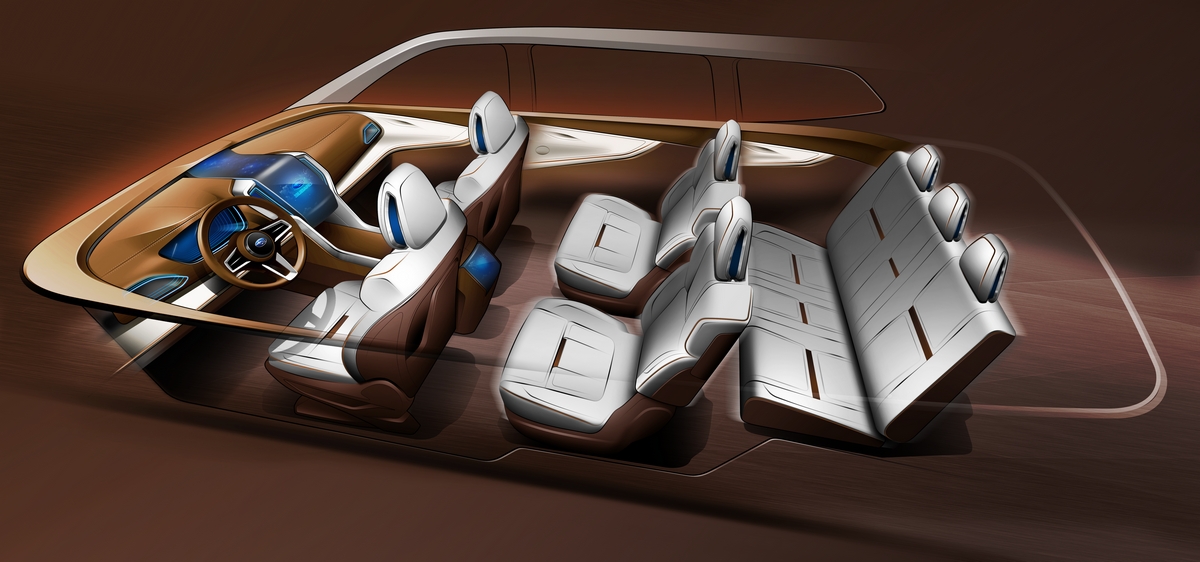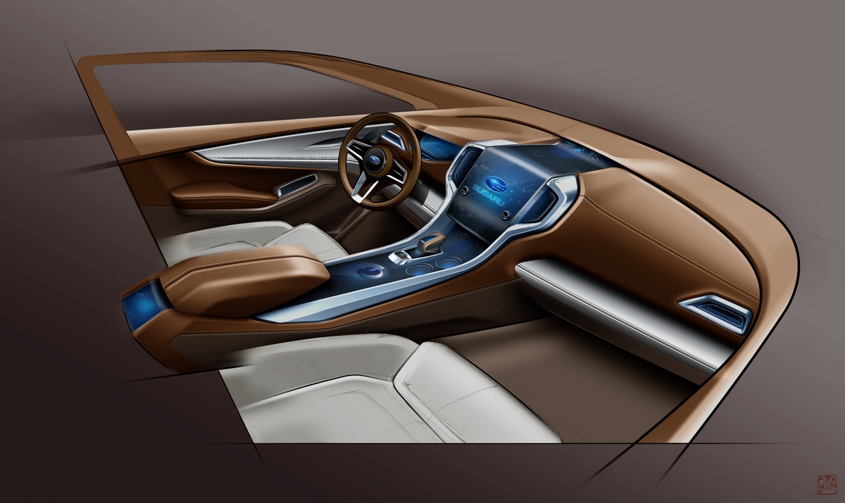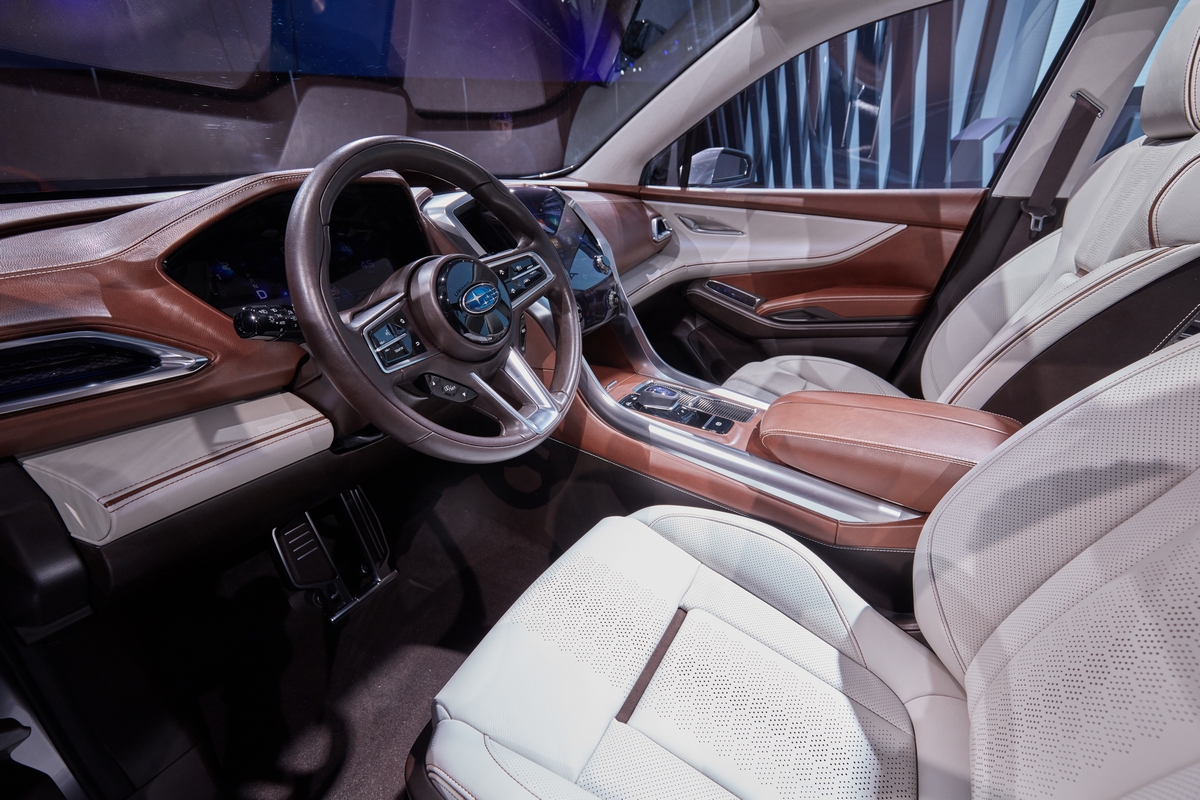 The exterior design of the concept follows Subaru’s “Dynamic x Solid” theme with powerful fender flares representing Subaru’s all-wheel drive system and a large, bluff grille denoting a true SUV look. The interior of the concept features a flowing dashboard design and a 7-passenger configuration with center captain’s chairs.