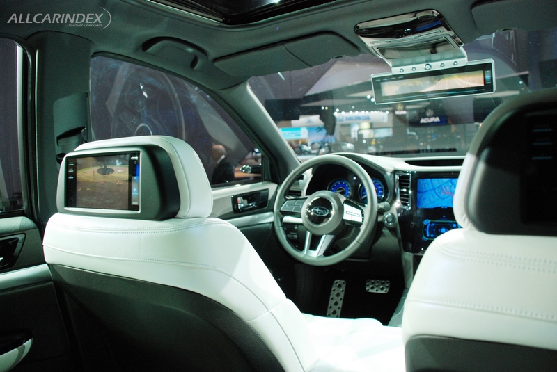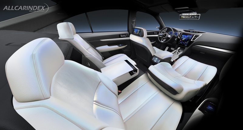 The concept behind the interior design is "High Definition". A striking four-seat layout has been adopted in order to provide enough space to fit four adults in comfort and style. The combination of a roof design that provides a feeling of freedom with the expansive legroom delivers a vehicle that can be truly classified as a global mid-size sedan without losing its sporting pretensions. For the seats, Pearl White leather with a blue sheen has been adopted, while Black metallic leather has been used for the door trim to create a luxurious contrast with the instrument panel. The center panel features a large touch-panel display that concentrates the various functions to provide ease of use, while the adoption of a cylindrical-shaped design that extends vertically emphasizes feelings of strength and solidity in union with the exterior. A steering wheel and shift lever have been adopted to accentuate the sporty aspect that is elemental in the Legacy Sedan. The monitor of the Side Rear Vision Camera has been situated towards the front of the roof in order to maximize rear visibility. For interior entertainment, monitors with entertainment functions have been located in the center panel and rear surface of the center console, as well as in the rear of the front seat headrests in order to provide comfortable functionality as well a calm design that creates a relaxed ambiance for the four adult passengers.