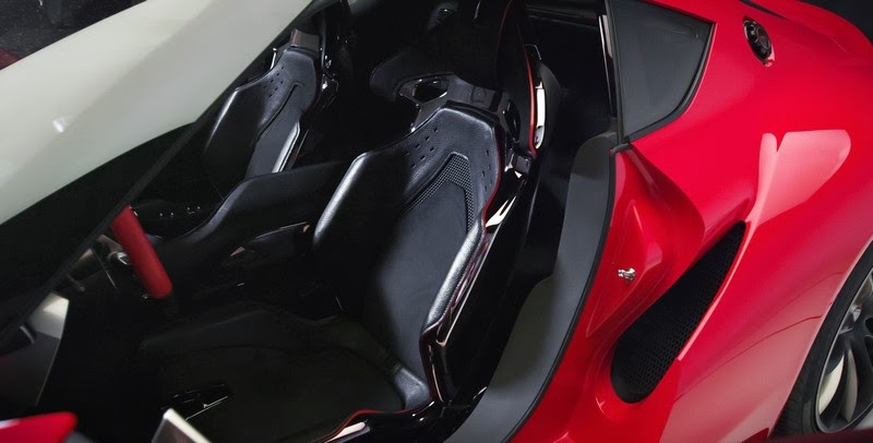 The interior is a focused, highly functional “place of business” that locates the driver at the controls behind an F1 inspired steering-wheel. The intimate, low slung cockpit has its A-pillars set far back to help optimize cornering vision and sensation of the cabin’s intimacy. A delta-shaped display zone surrounds and integrates the driver to provide an exhilarating sense of being connected to the vehicle. The cockpit’s sense of minimalism adds to the purposefulness of the driver-focused environment with an emphasis on light weight components such as the composite seat covered with just the right amount of padding in only the areas that come into contact with the driver. A color heads-up display keeps the driver’s attention on the road ahead, with vital information projected just above the steering wheel within the driver’s line of sight.