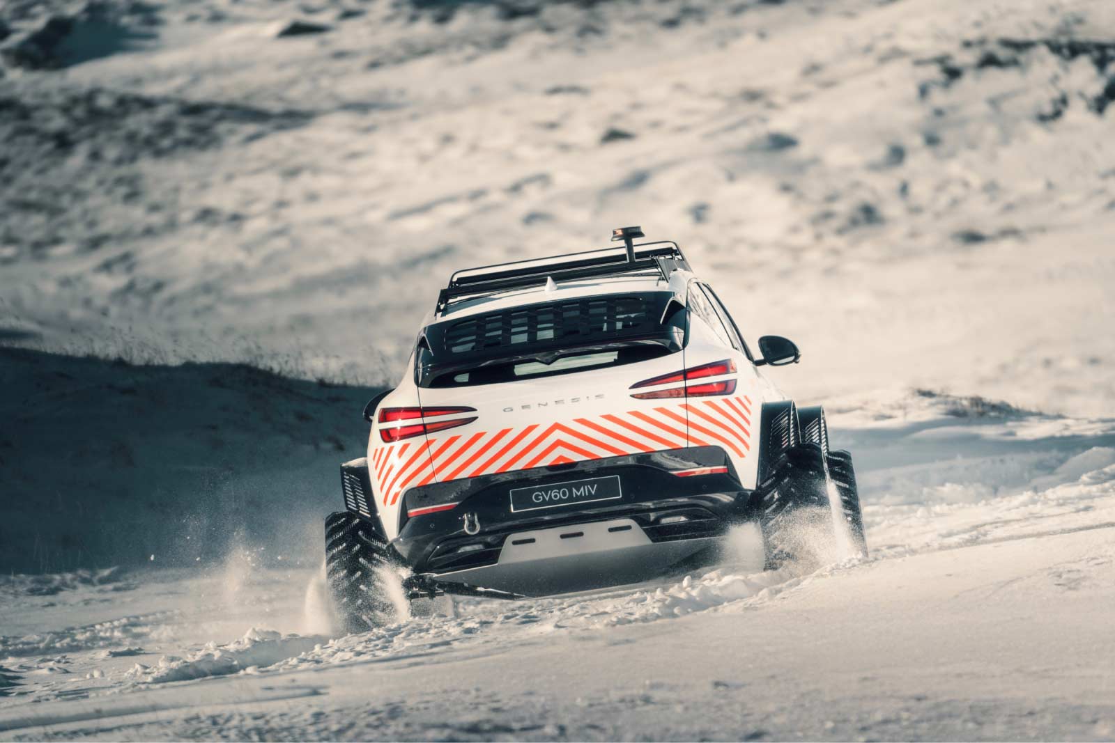 The GV60 MIV Concept comes with snow tracks and features like sports seats, medical supplies and emergency communication and warning systems that support mountain rescue operations in extreme conditions.