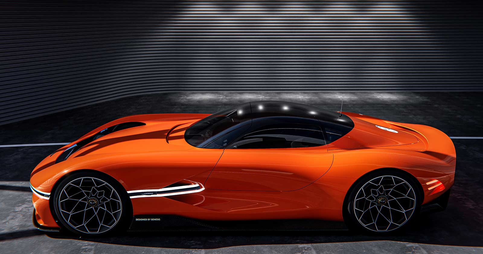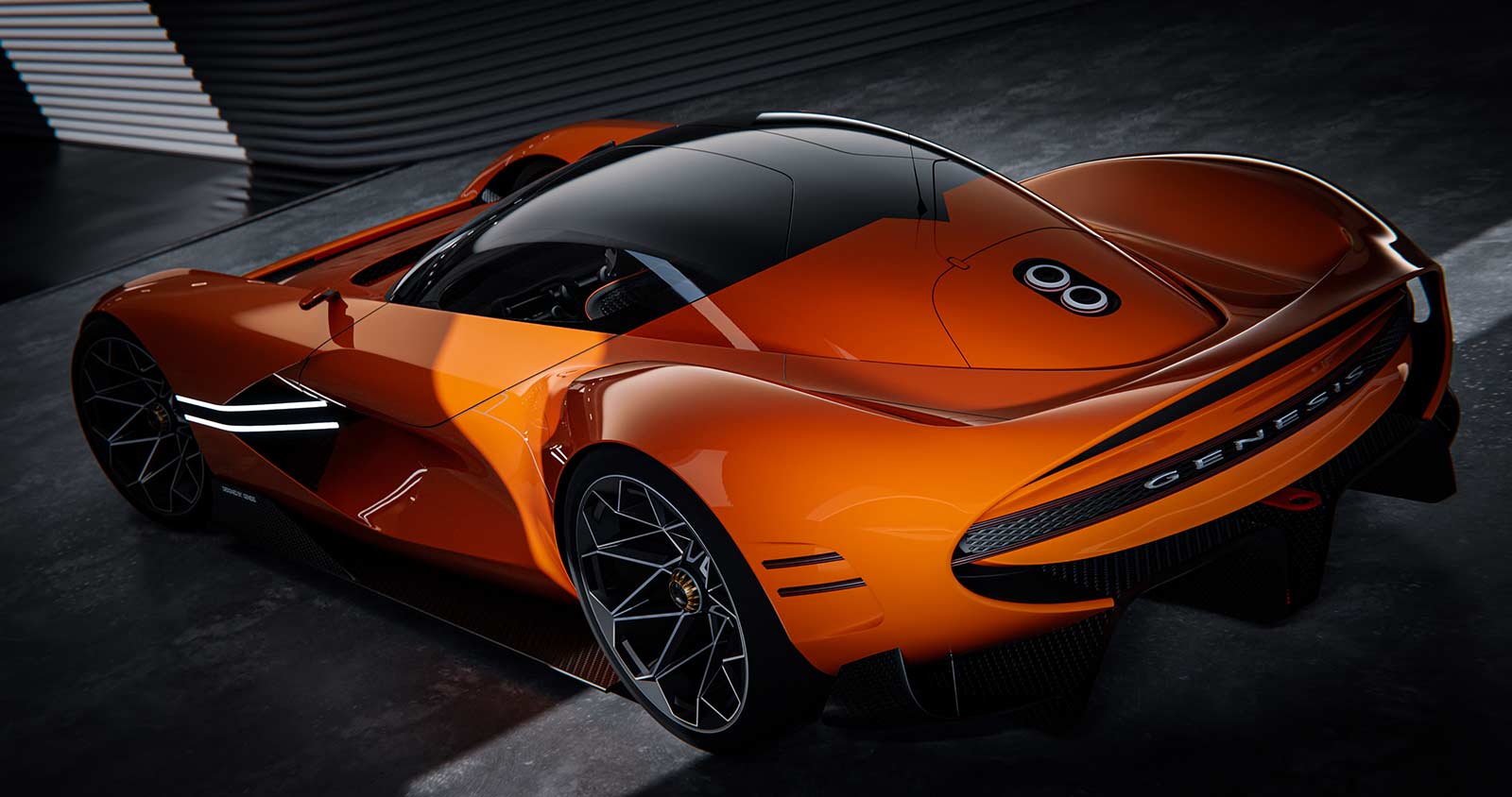 The fuselage extrudes towards the rear, culminating in an elliptical concave volume, which is common to Genesis vehicles. It is framed by a rear spoiler and lateral trailing edges for aerodynamic high-speed stability. The contrast of energetic body sculpture with technical aero details creates the ultimate expression of grand touring spirit.