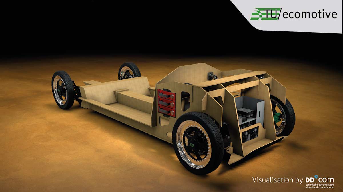Lina is a four-seat electrical city car. Lina weighs only 300 kilograms, making her a very efficient car. This weight is realized using an innovative structural bio composite material made from flax. This material has a structure that is comparable with carbon fiber, but more than 90% biological. A sandwich panels is created by pressing two composite sheets against a 95% biological honeycomb PLA. These sandwich panels will be combined to form Lina’s chassis.