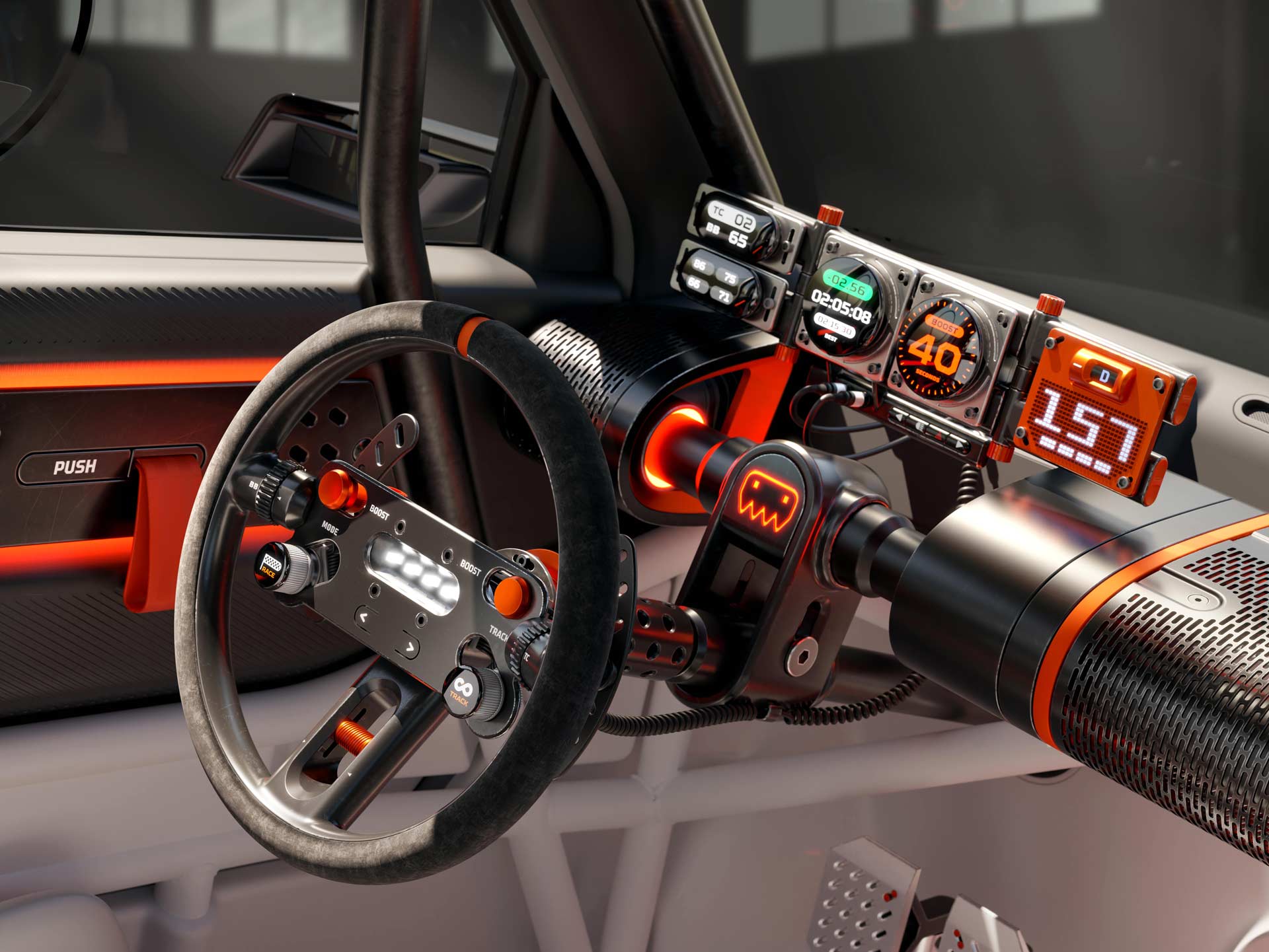 Inside, the cockpit offers a stripped-down layout, with bucket seats, a roll cage and a specialized instrument cluster creating an immersive driving experience. Every element is fully adjustable, reflecting the user-centered spirit of a garage-built machine true to the motto: “Build it, play it, break it, repeat.” Adding to its multisensory experience, INSTEROID produces a unique sound signature, leaving an unforgettable impression.