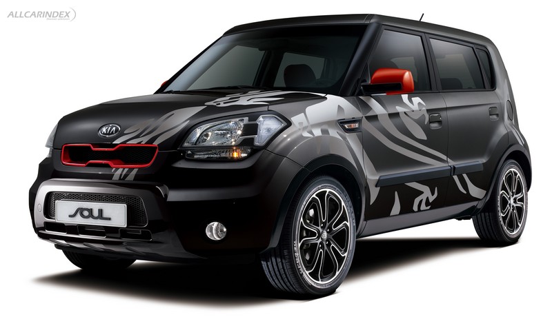 The Kia SOUL Burner is the ´bad boy´ of Kia´s three new concept characters. A ´show-off´ complete with dragon tattoos. From the outside, it is a mean, totally black beast with sparse flashes of scarlet. The tattoos are gloss black on the black satin paintwork, which shows a large dragon creeping over the bonnet. On the other side, a small dragon climbs up the C-Pillar.