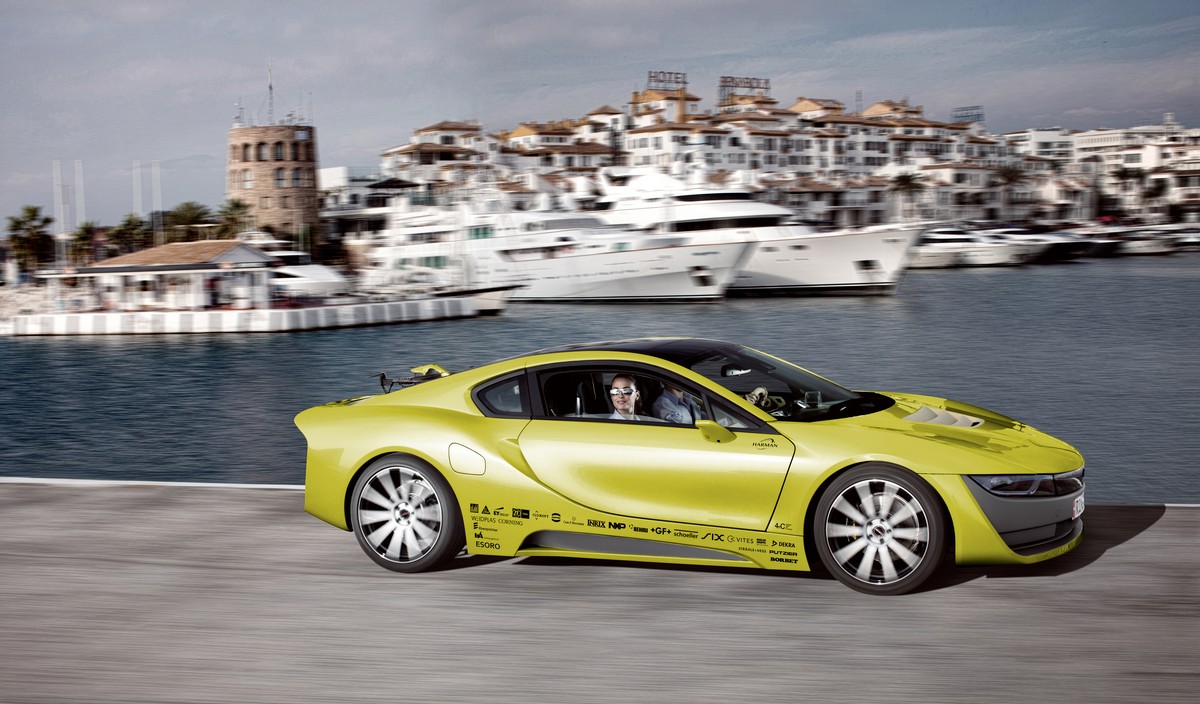 where and how long they can expect to make phone or video calls without interruption, the technology also allows smooth media streaming as well as efficient and targeted vehicle updates. The seamless link to the traffic infrastructure such as traffic lights or traffic management systems and to other cars, especially emergency response vehicles, lets drivers and the vehicle look far beyond their own horizon and even through obstacles. The so-called ‘E-Horizon’ provides innovative safety and convenience features such as precise warnings of wrong-way drivers or simply gliding along smoothly in sync with the phased traffic lights. Speaking of seeing: The gaze-tracking system of the “Ʃtos” permanently monitors the driver’s eye movements and as a result, the vehicle not only knows what the driver has seen, but also what he has failed to see. This allows custom tailoring the displayed warnings and notifications. For precisely this reason, the electronic exterior mirrors only display an image when the driver consciously checks them. The HMI was designed and programmed by Luxoft. Georg Fischer Automotive supplied the aluminum lightweight-construction frame for the three displays. As always, the Helvetian think tank, which following an old tradition once again commissioned the Swiss colleagues of 4erC to design the twenty-second concept car and Esoro to handle the technical realization, explores the existing digital possibilities - and demonstrates new ones. The “Ʃtos” is fitted with an on-board DJI drone complete with landing platform in the rear. An armada of 12,000 individually controlled LEDs can transform this platform into an electronic message board or a visual dancefloor. This technical marvel was designed by Swiss specialist Weidplas, which is also behind the rear window that has been converted into a third brake light and the brilliant seat inlays. The drone itself is capable of providing some very useful services. For example, it can quickly pick up a bouquet of flowers for the significant other ordered on the way home. And the little flyer is a lot of fun when it acts like a UFO, shooting a selfie of the ride in the “Ʃtos” on your local favorite route and streaming it live to friends. Heads up: that little thing has an extremely high addiction and envy factor! The elegantly and futuristically styled “Ʃtos” - on the technical basis of the BMW i8 - is a sustainable but also a fast racer. The deep black and shiny 20-inch Borbet GTX aluminum rims leave no doubt about that. They give the body an imposing visual width and provide perfect handling on the track. To make the athlete as light as possible, Corning manufactures the glass roof and the “drone pad” in the rear from especially strong, lightweight and thin Gorilla glass, the same kind used in smartphones. The aluminum front structure and the carbon fiber passenger cell are joined together with ultra-high-modulus adhesive from Sika. No question, Rinderknecht not only plays the role of the visionary, but also that of the magician in Las Vegas. And since a great show also goes hand in hand with unusual eye-catching packaging, the Swiss national uses ceramics and metal alloys in the “Ʃtos.” They are applied at temperatures above 20,000 degrees Celsius and at supersonic speed. The result is a unique appearance, a new touch and feel and a novel functionality that are all unprecedented in automotive construction. Apart from delicately designed trim strips, the vehicle sports rims with a titanium protective edge and non-slip titanium pedals. These magic moments come courtesy of the specialists from the German company Putzier Oberflächentechnik. Touch it, feel it - it really is magic!