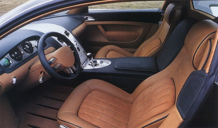 Nubuck and Connolly leather in dark green and tan and engine-turned aluminium, the surface treatment of which mirrors the aluminium used for some of the external parts such as the spoilers, bumpers and the entry area.