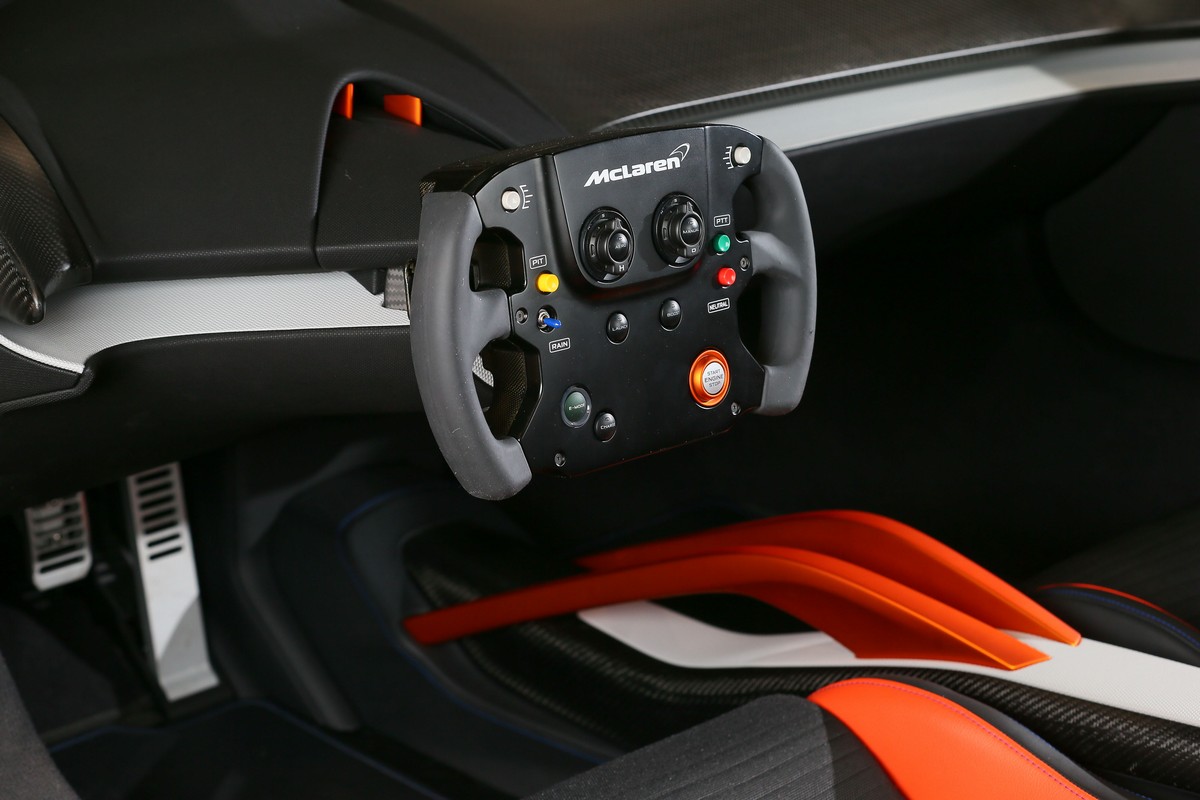 Calypso Orange Nappa Leather is applied to the bolsters of the 675LT racing seats and to the armrests around the hip point. These disappear out of sight once the driver is seated to give a focus on driving. The orange accent chases the eye down through to the tunnel-mounted leg restraints. Further flashes of orange appear on the seat shoulders for the seat belt guides. For the seat backs, centre of the tunnel and armrests, more Satellite Grey Technical Fabric is employed. The seat centre and floormats, complete with 675LT logo, are covered in hard wearing Strata Ribbed Textile, a new material for this concept. Above the driver sits the monitor for the Digital Rear View Monitor (DRVM). It has been integrated into the Carbon Black Nappa Leather headliner and framed with Deep Cobalt Blue stitching that continues back across above the driver and passenger.