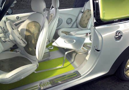 Satellite Silver serving as the interchanging silver and grey multi-layer paintwork, white and green leather with constantly changing surfaces and a different feel ranging from rough leather all the way to the seat bottoms and backrests in Chesterfield pattern, innovative glass-fibre tissue and a carbon look on the inner door panels as well as metallic glass-fibre optics in the footwells – all this clearly shows what travelling in genuine British style means to MINI at the beginning of the 21st century. Indeed, the very name 'MINI Concept Tokyo' stands for an exceptional ambience and the clever use of space.