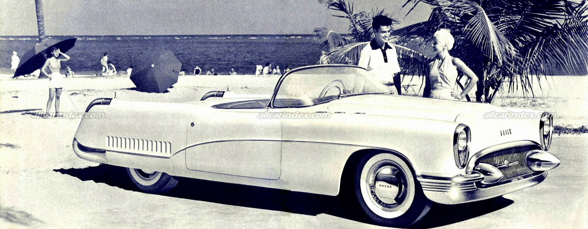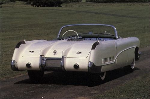 The 1953 Buick Wildcat I was a concept car designed and built primarily to test the use of fiberglass in automobile bodybuilding. Fenderports (used for cooling) were placed on top of the fenders rather than on the sides. The one-piece windshield was a wraparound type with a 60-degree slope to the rear. When the top was down it recessed into the body of the car with a special panel covering it (eliminating the use of a boot)