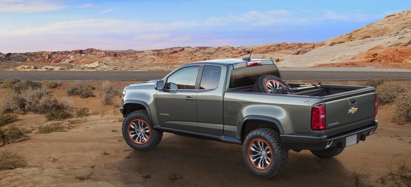 The Colorado ZR2 wears a concept Cyprus Green exterior color, with Henna Orange accents and custom ZR2 identification on the rear fenders, tailgate and grille.