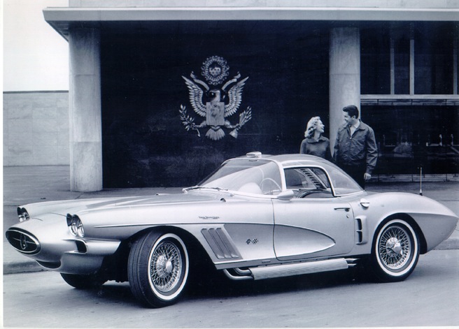 First shown in 1959, the Chevrolet XP-700 was revised in 1960 with a longer and smaller grille, extended tail and double bubble plastic roof, complete with a periscope rear-view mirror. The transparent canopy was like a one-way mirror, passengers could see out, but outsiders would see their own reflections. Originally painted red, the version that appeared during the 1961 Chicago Auto Show was finished in pearlescent silver, which matched the silver cockpit. The exposed side pipes were retained from the 1959 version, as was the rear wraparound bodylines that predicted the design used on the 1961-1962 production Corvette.