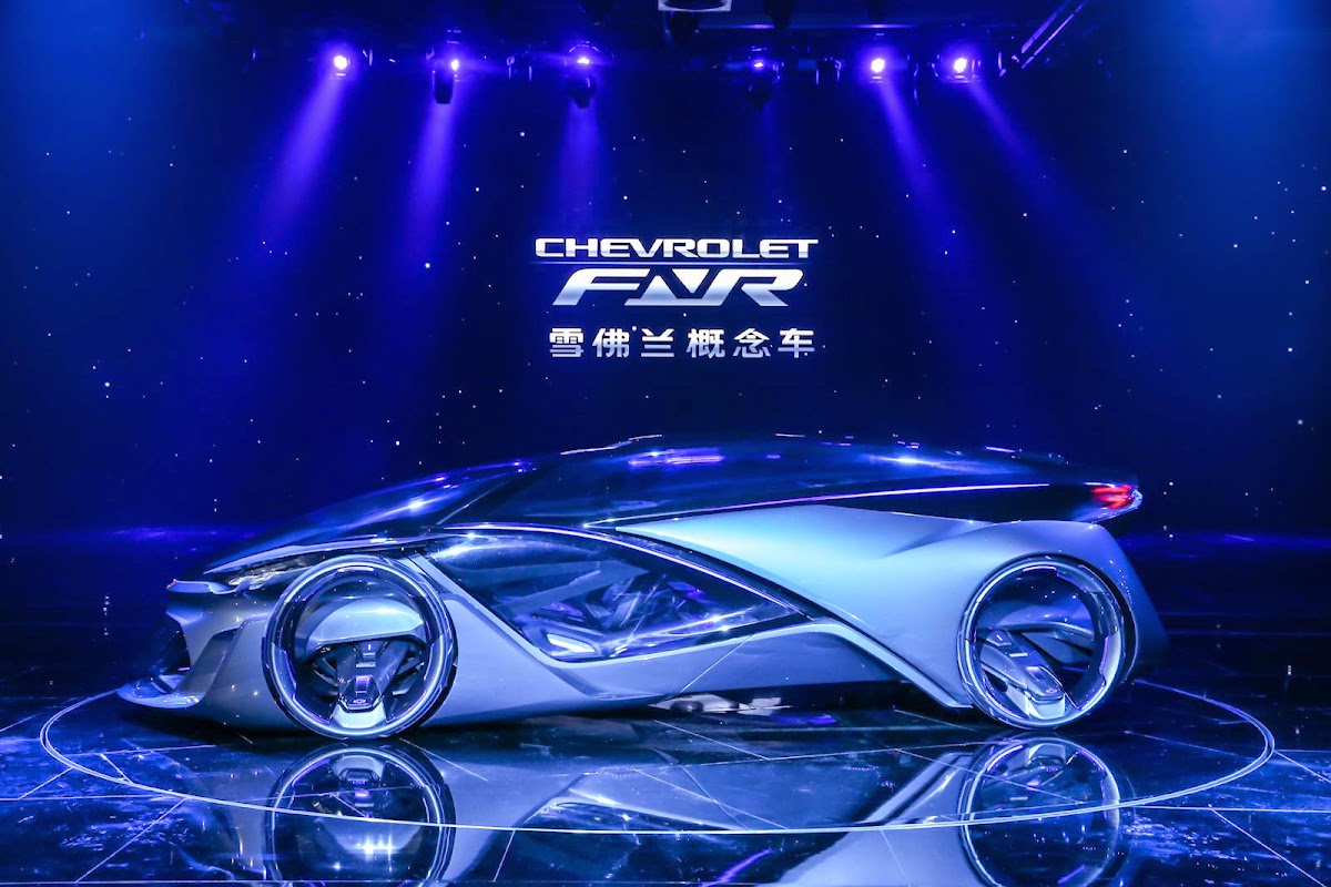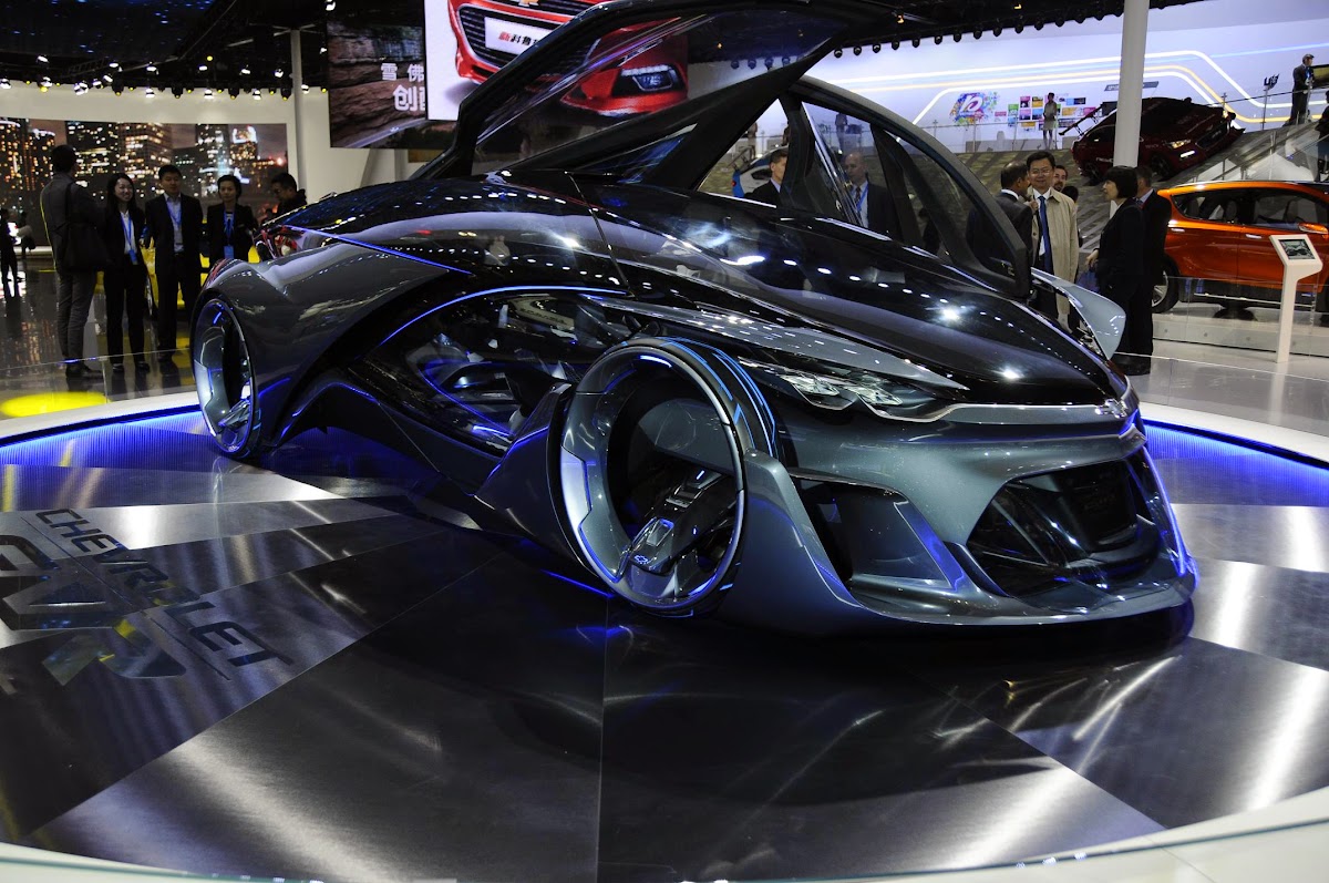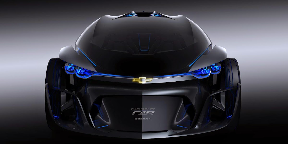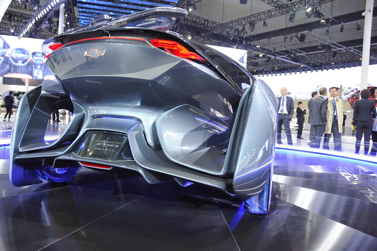 The Chevrolet-FNR boasts a futuristic capsule design. It has crystal laser headlights and taillights, dragonfly dual swing doors, magnetic hubless wheel electric motors and a wireless auto-charge system.