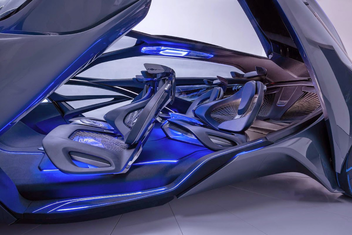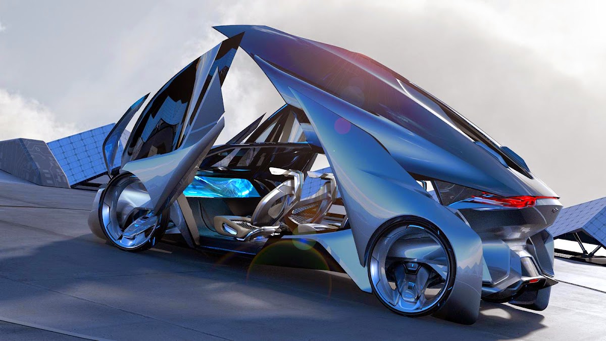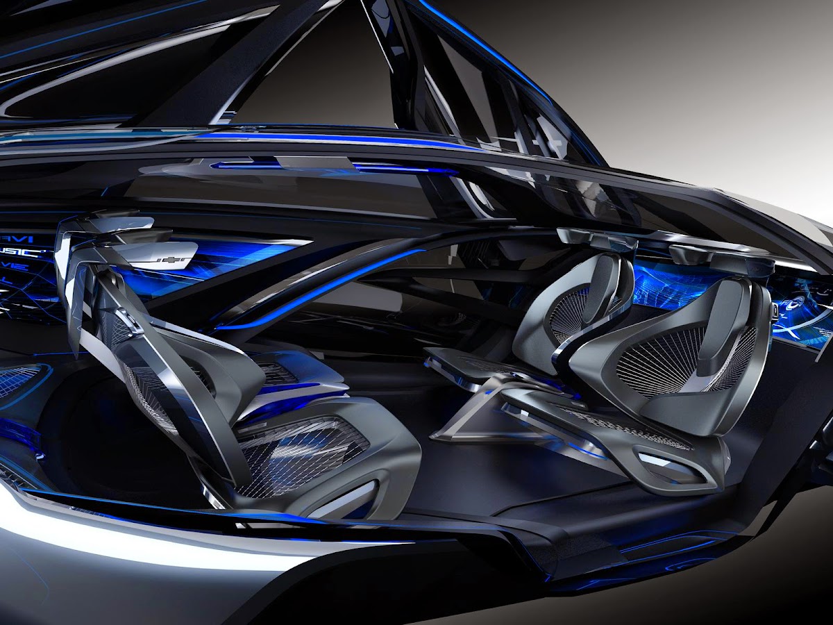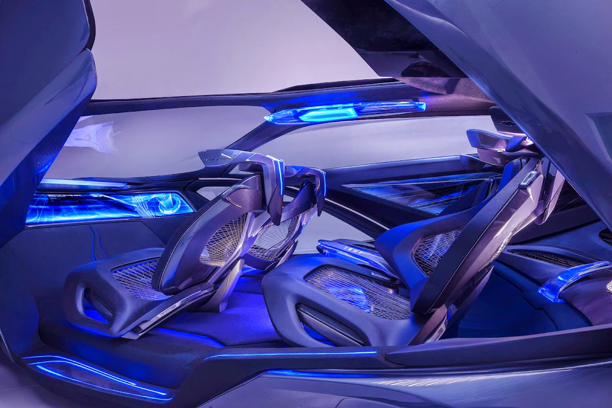 The Chevrolet-FNR boasts a futuristic capsule design. It has crystal laser headlights and taillights, dragonfly dual swing doors, magnetic hubless wheel electric motors and a wireless auto-charge system.